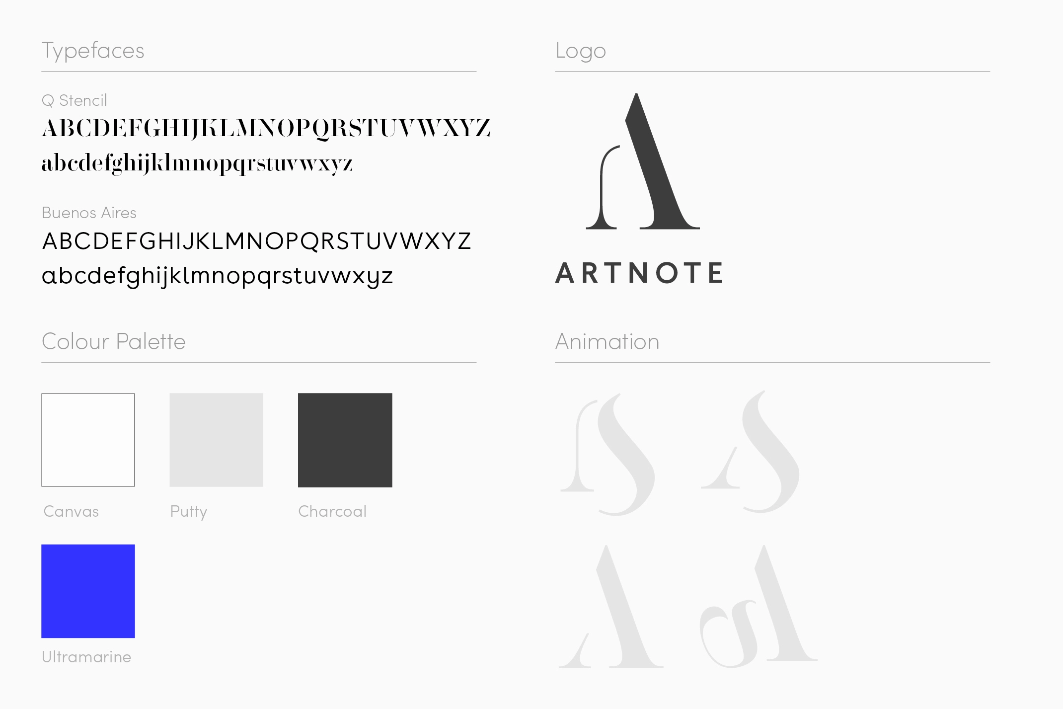 Building on the idea of the wunderkammer, which literally translates as a cabinet of wonders, we created a logo which celebrates the eclectic nature of the artworks the app users may bring together. The letterforms are broken apart and displayed almost as sculptural forms in themselves. This is used for the loading animation as well as printed pieces, becoming a motif that can be used and played with throughout the identity. This idea reinforces the idea that Artnote is a place for experimentation, and the dynamic logo reflects this in its constant changing form. Swapping one shape for another, but always being the A.