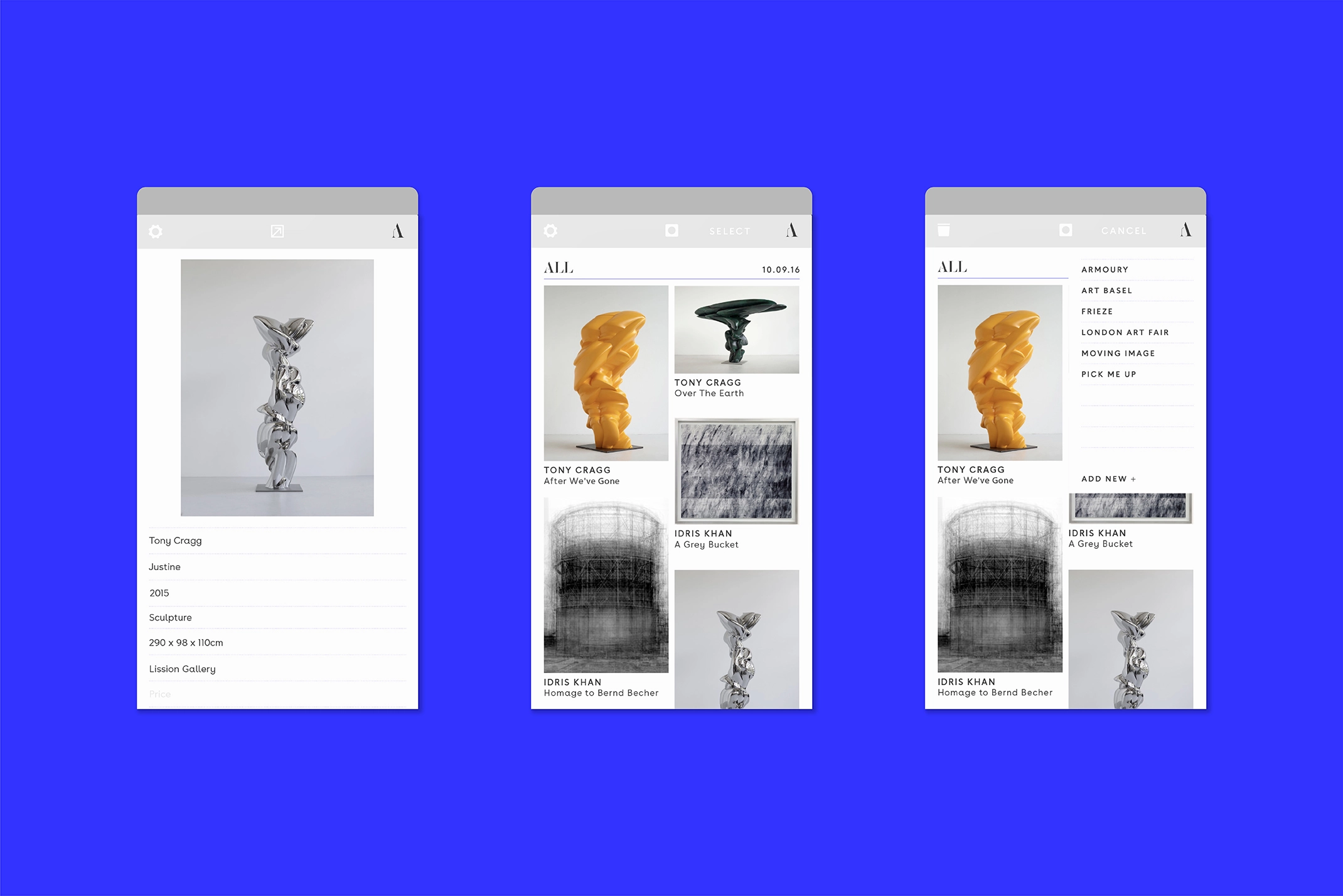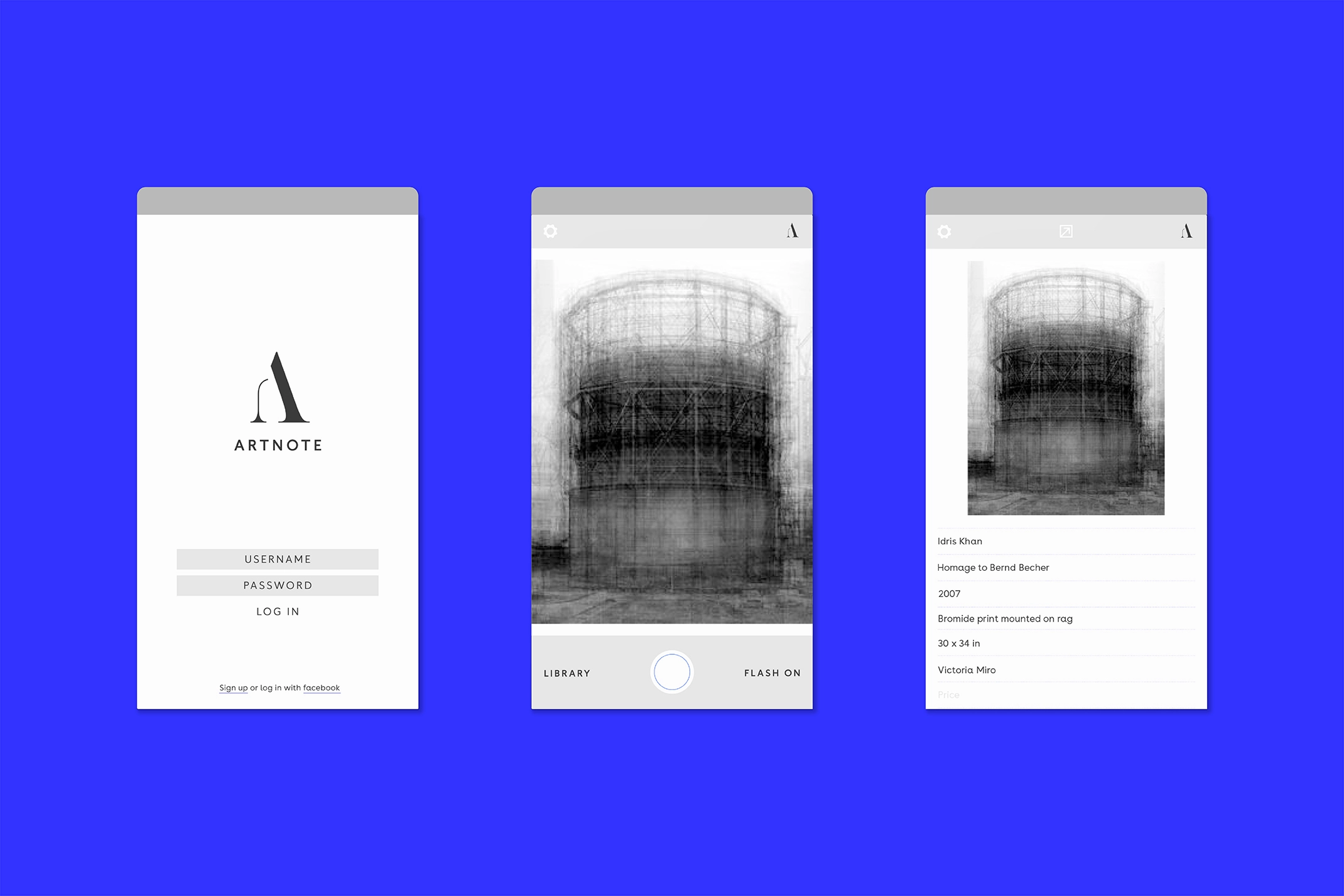 As the app had a very functional reason for being, the design needed to be clear and not distract from the art which was being recorded. We used a neutral colour palette to keep things simple but paired it with a bold electric blue to represent the energy and passion behind collecting.