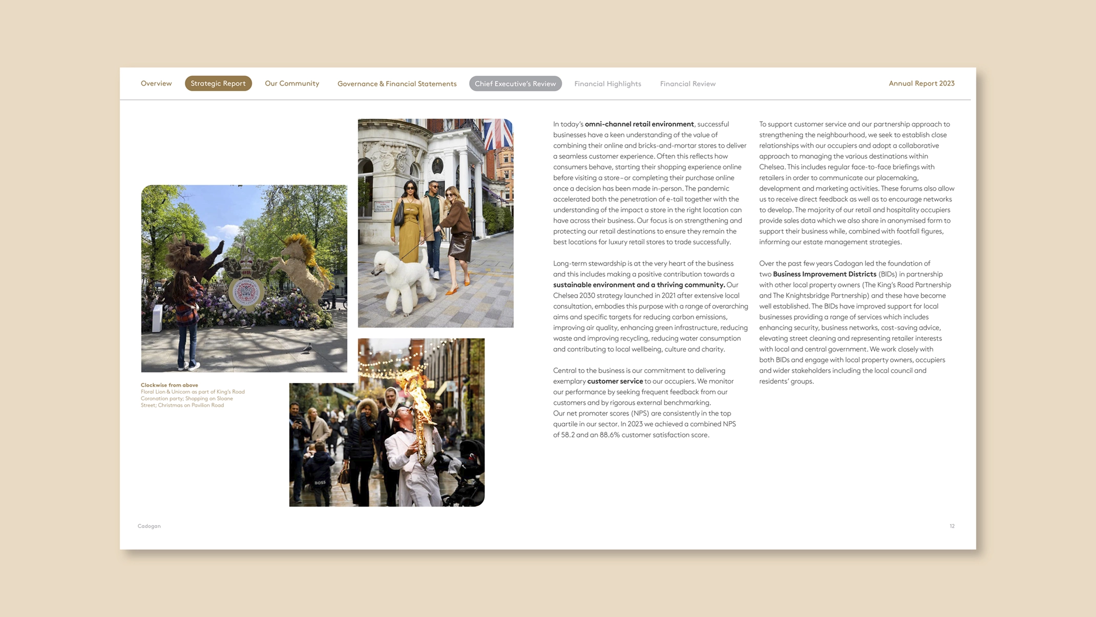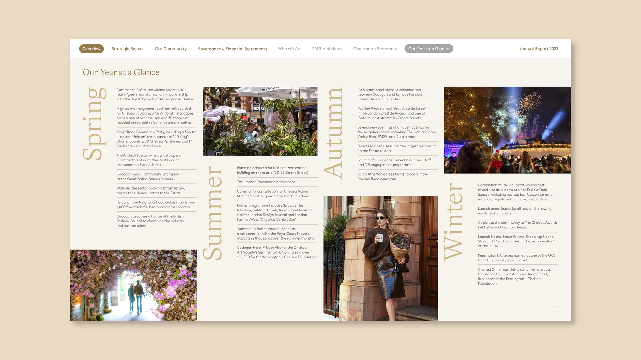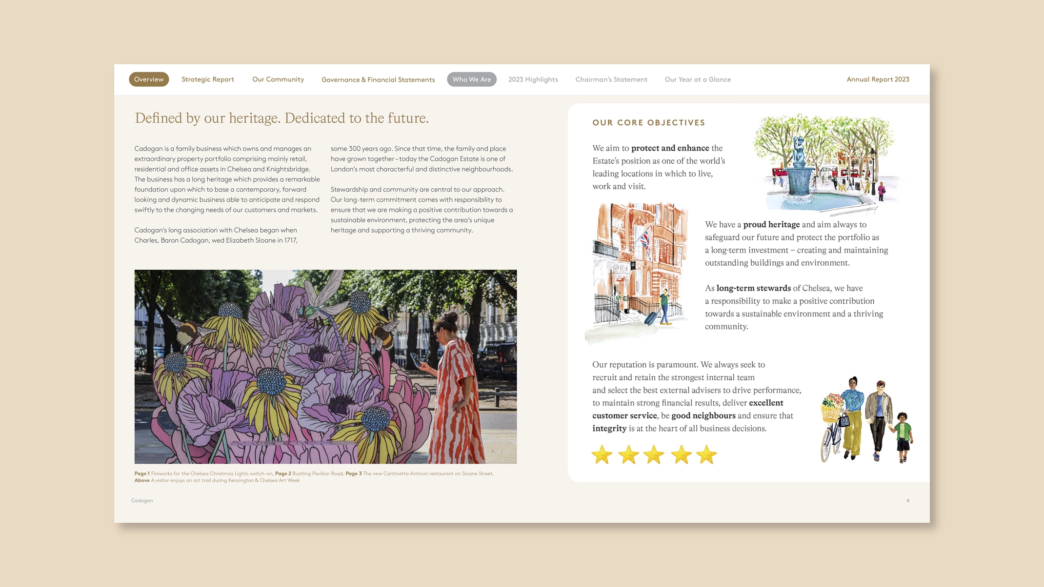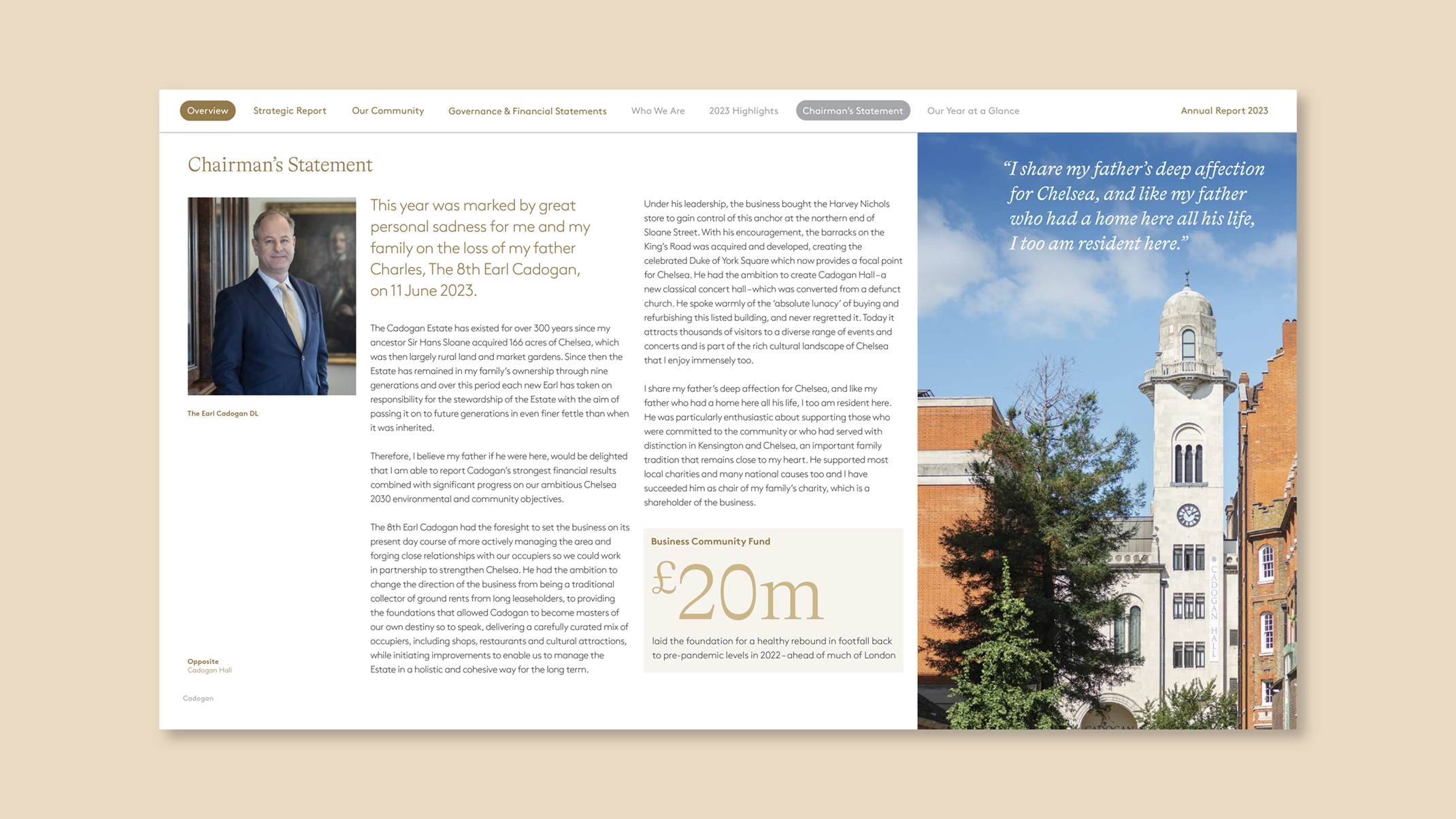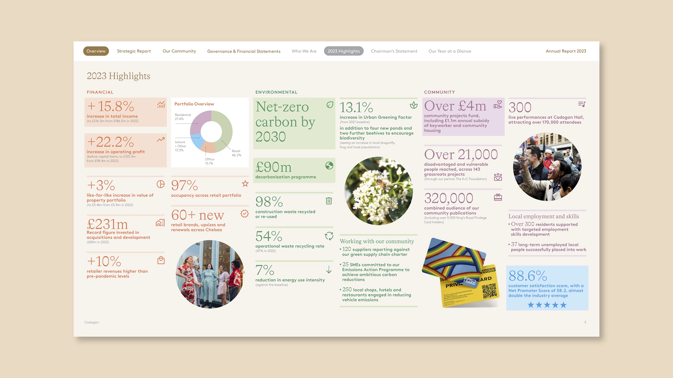 With more people viewing Cadogan’s Annual Report online, the 2023 edition got a fresh digital makeover. We revamped the layout for easier screen reading, added a handy navigation bar, and brought key stats and case studies to life with dynamic infographics.