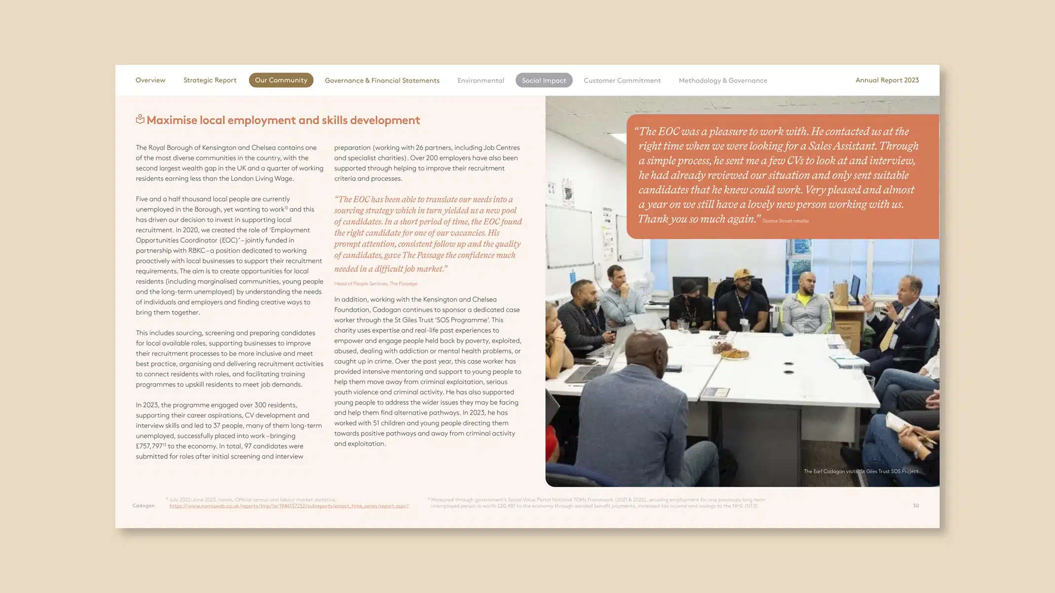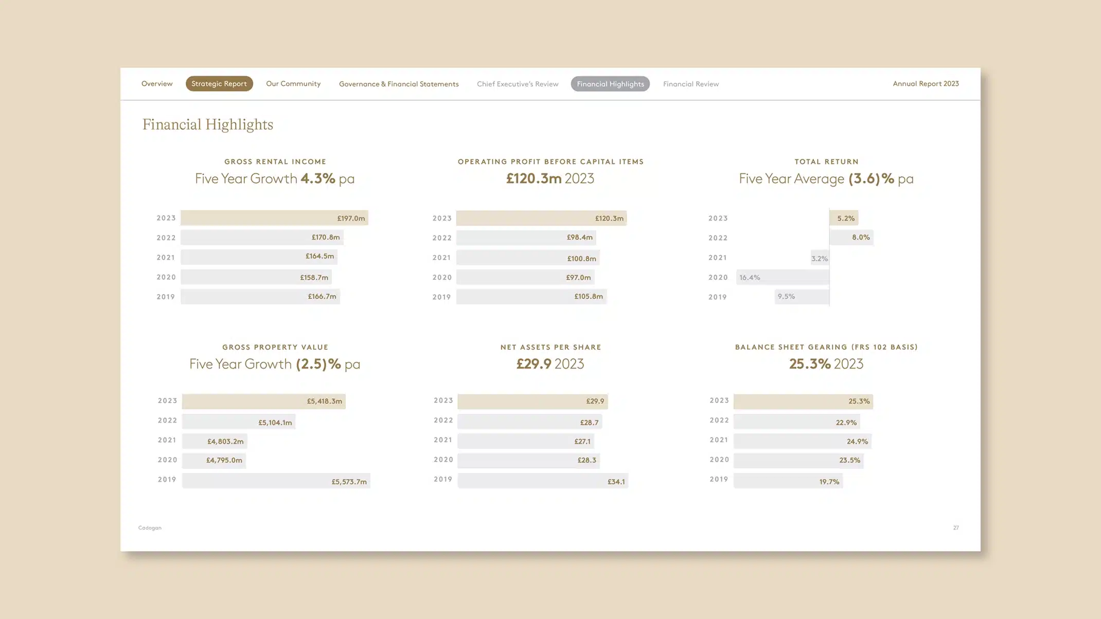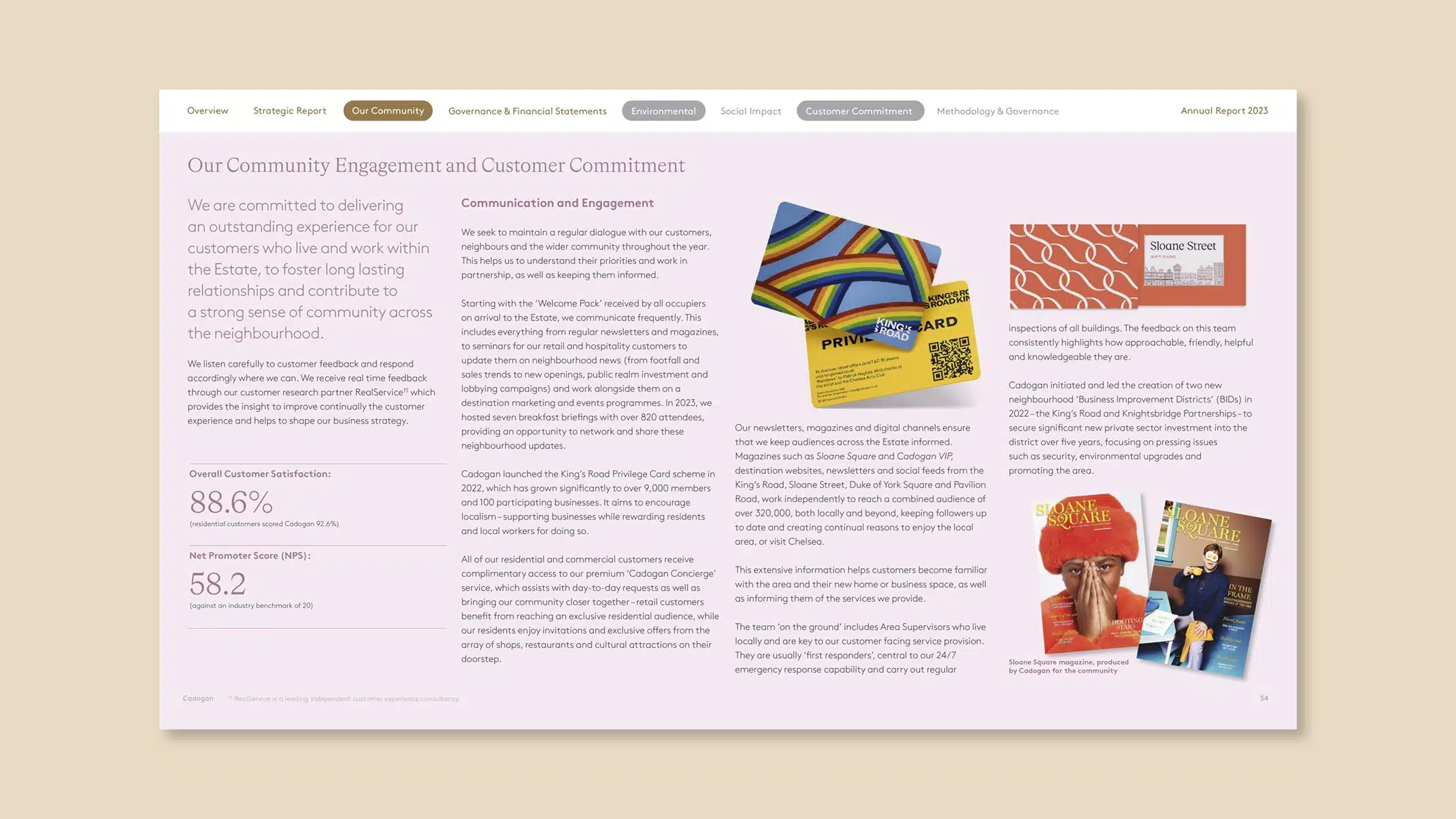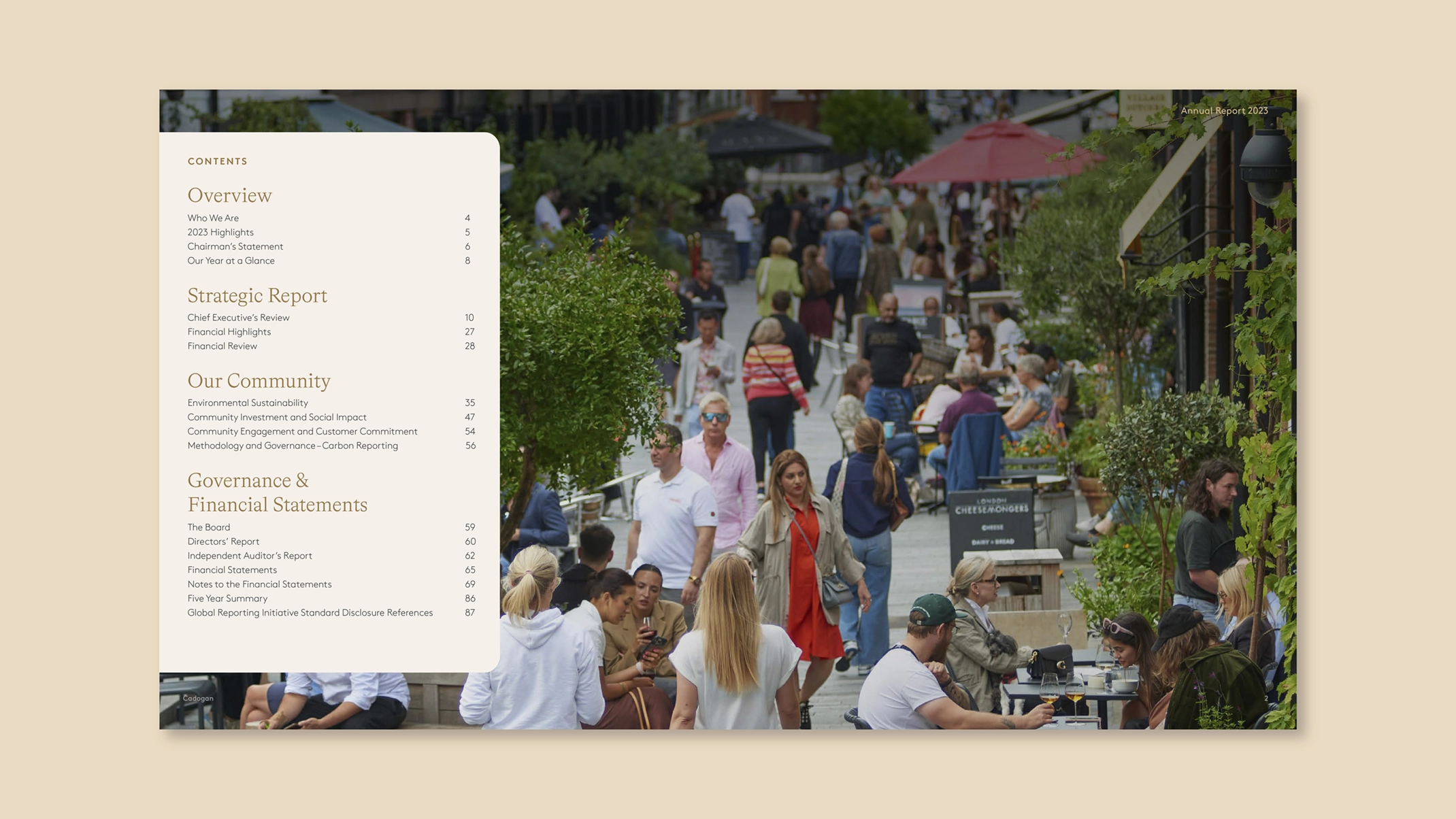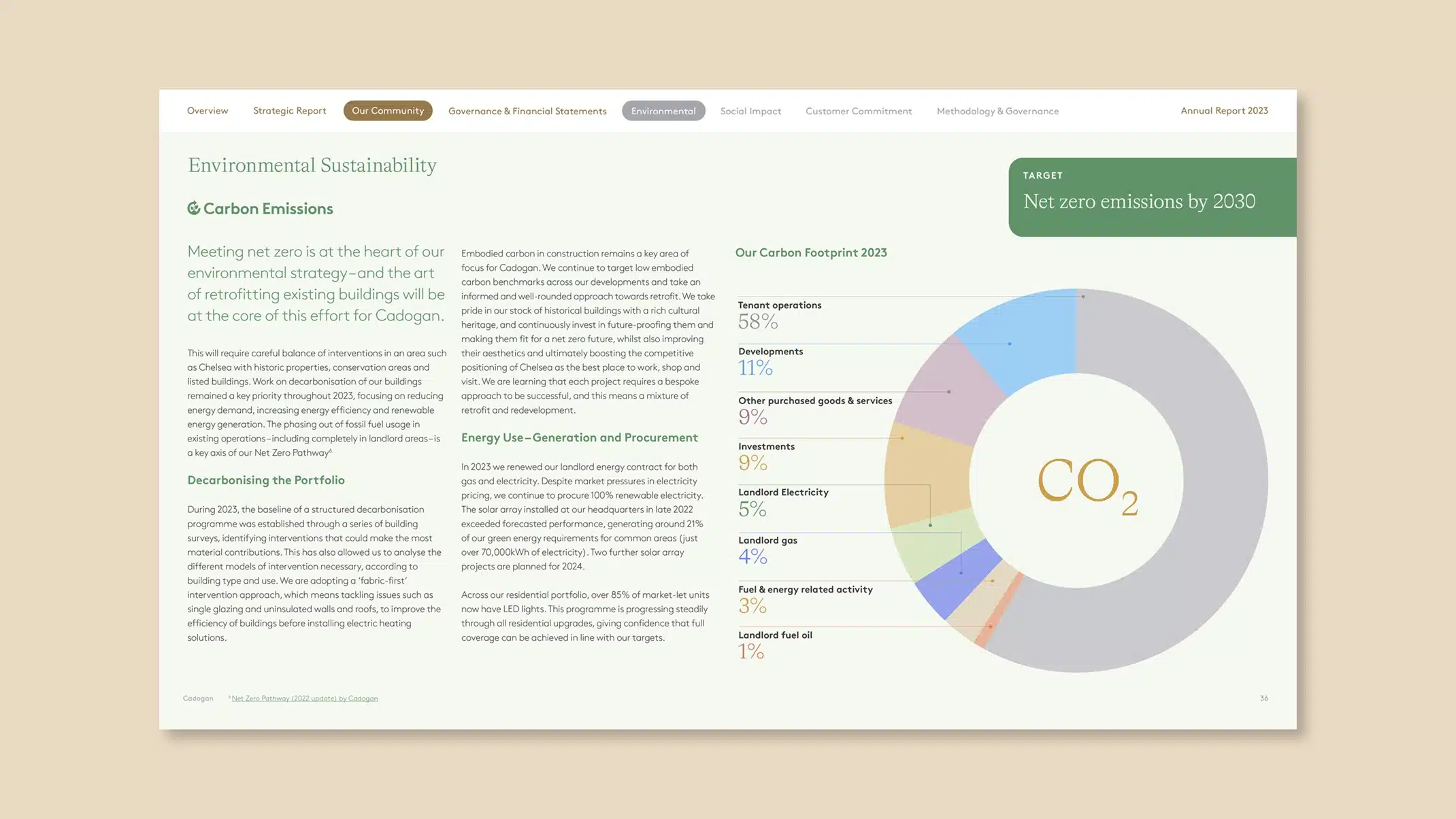 With more people viewing Cadogan’s Annual Report online, the 2023 edition got a fresh digital makeover. We revamped the layout for easier screen reading, added a handy navigation bar, and brought key stats and case studies to life with dynamic infographics.