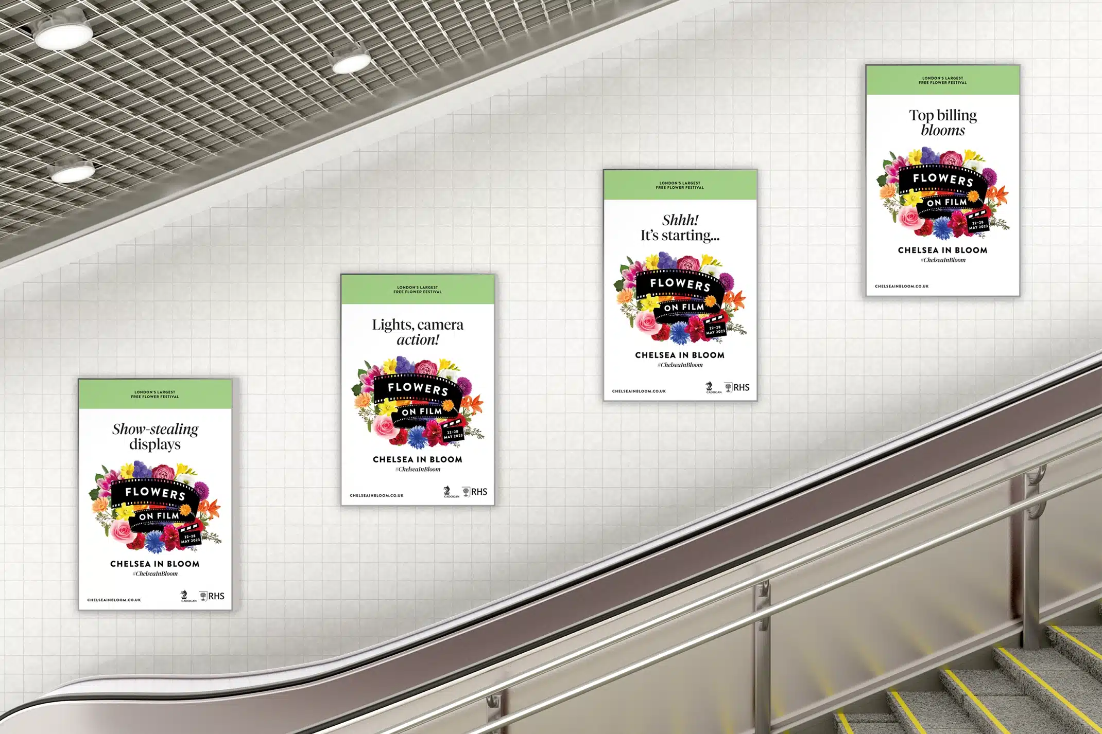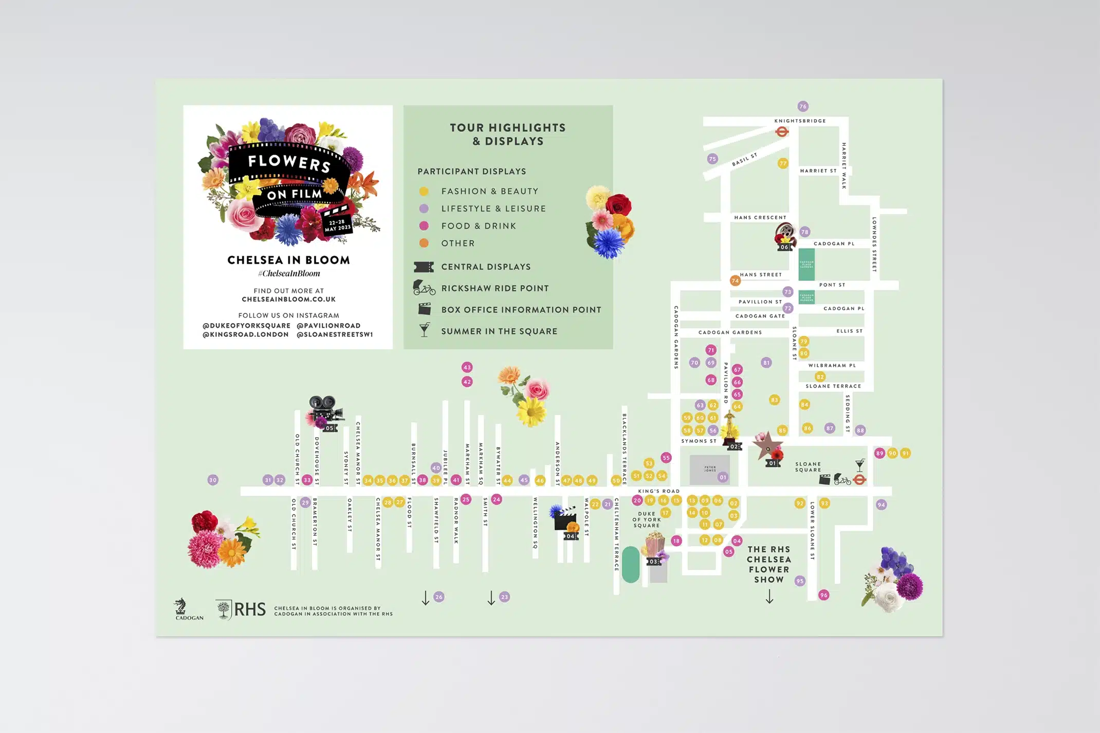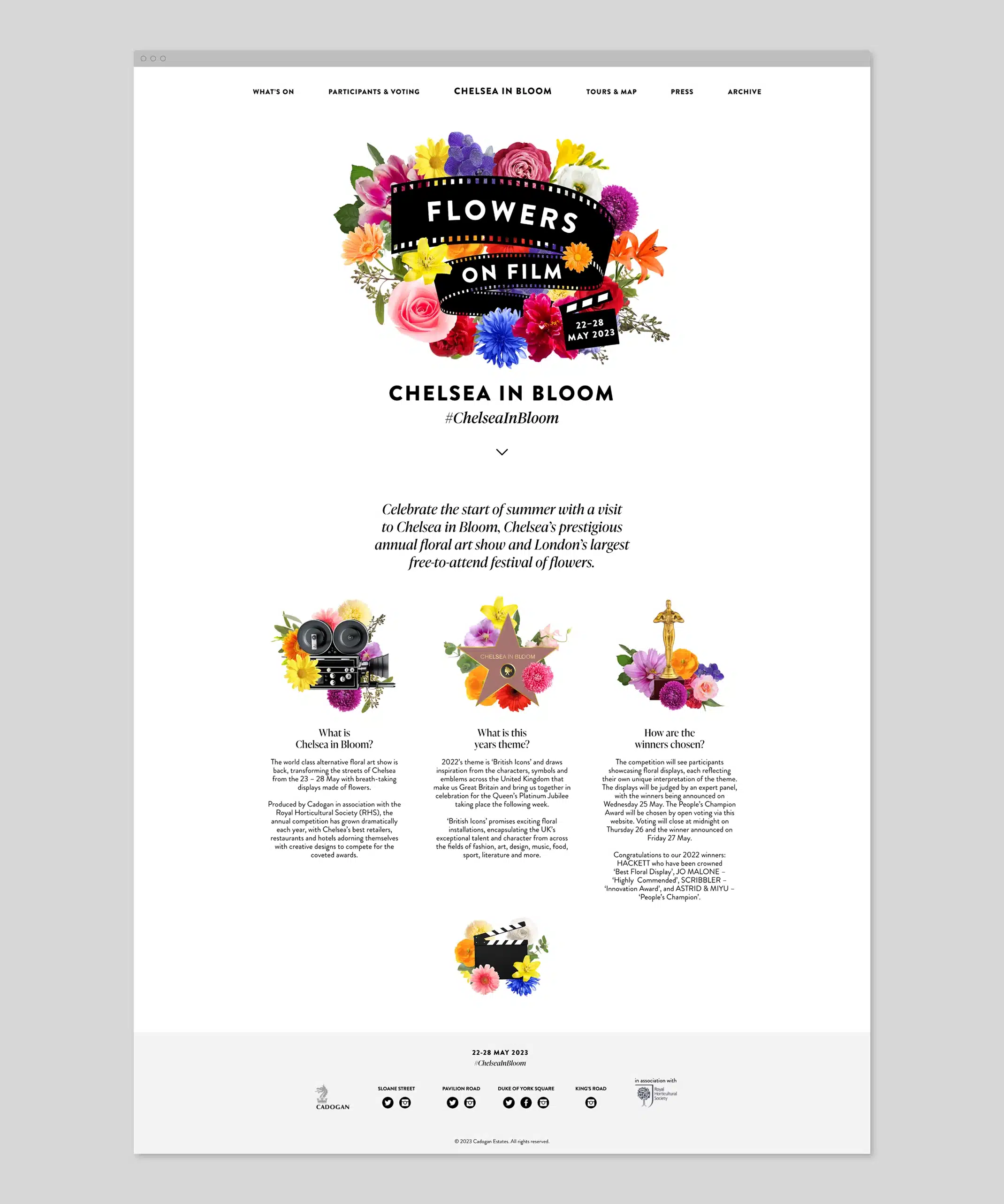 Each year Chelsea in Bloom transforms the streets of Chelsea with a world class alternative floral art show and breath-taking displays made of flowers. We worked with Cadogan to create the identity for this years event, with the theme ‘film’.