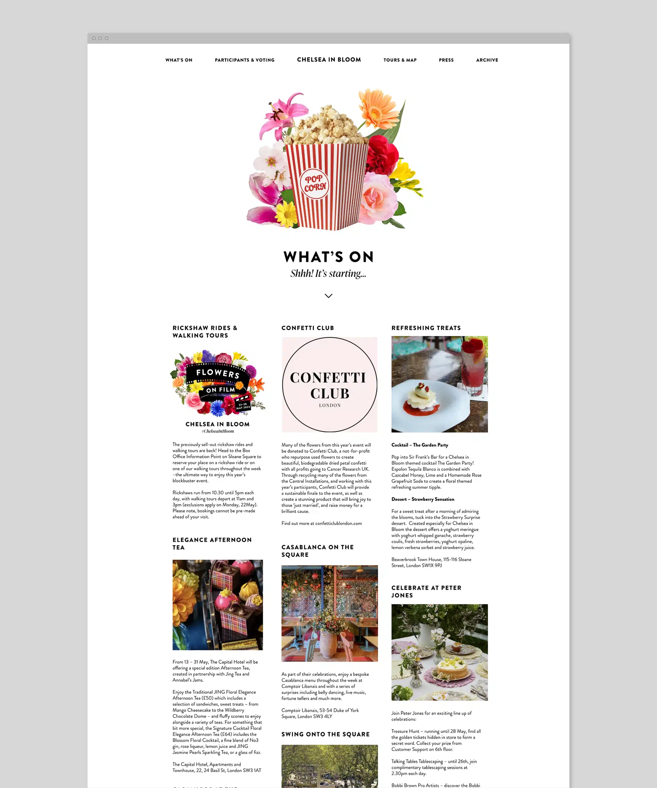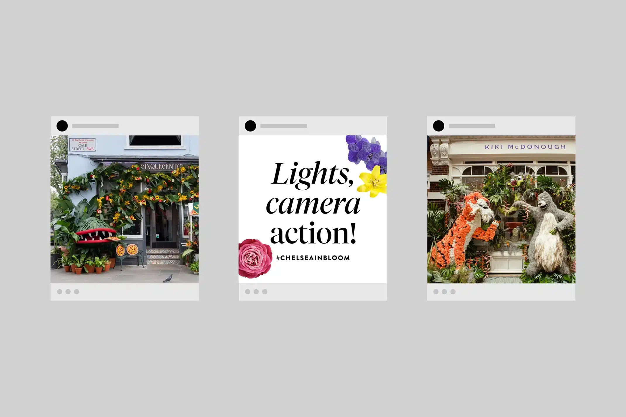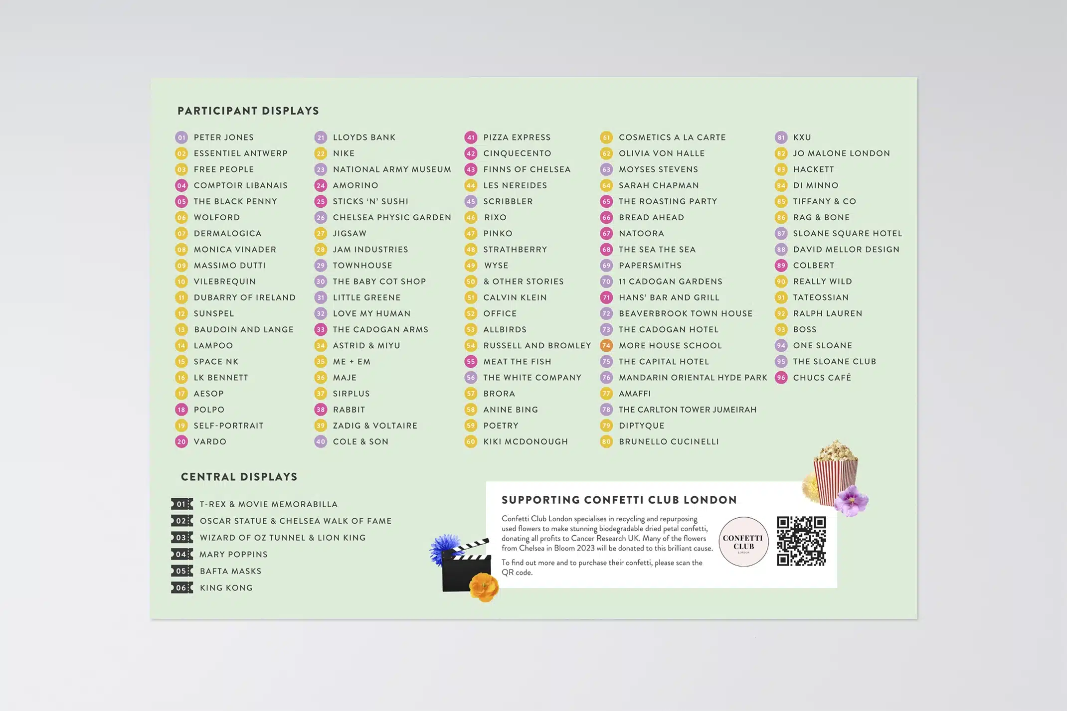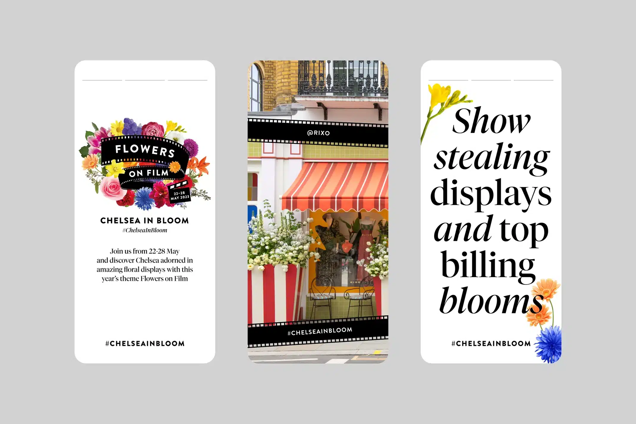 Each year Chelsea in Bloom transforms the streets of Chelsea with a world class alternative floral art show and breath-taking displays made of flowers. We worked with Cadogan to create the identity for this years event, with the theme ‘film’.