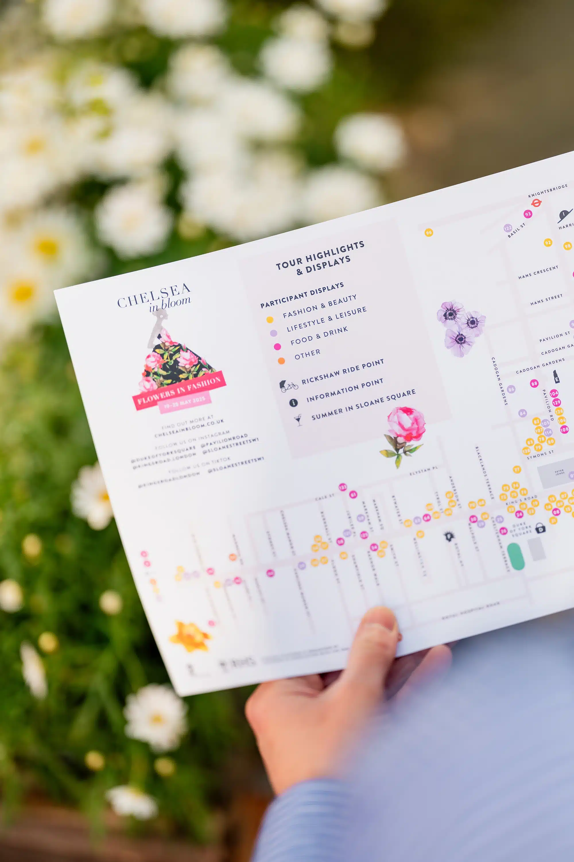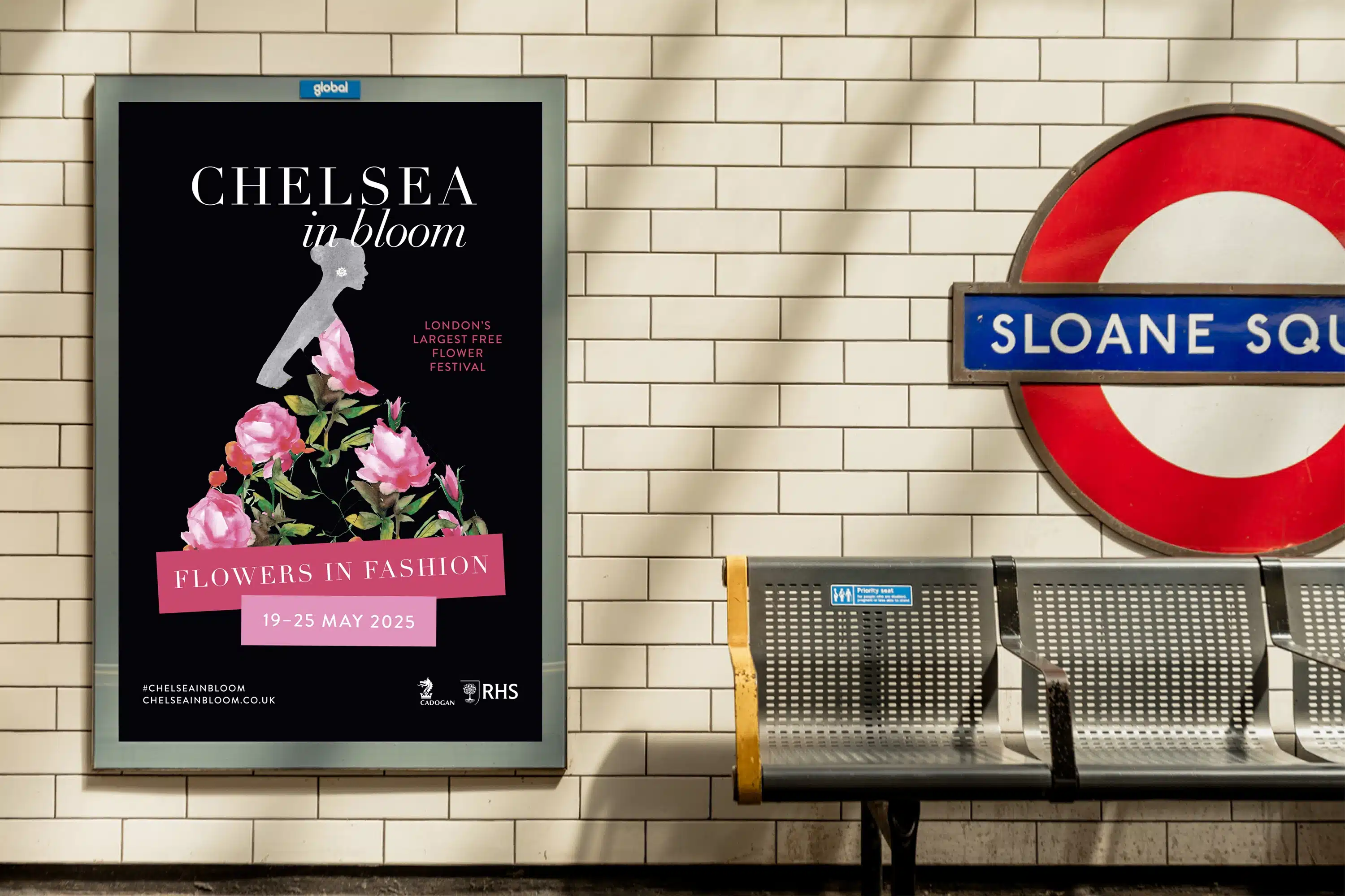 We worked with Cadogan to craft this year’s brand identity, themed ‘Flowers in Fashion’. As part of the branding we commissioned a bespoke illustration by Jessica Durrant—a fashion figure wearing a floral gown—which brought the theme to life. The design was rolled out across all touch points, including social media, advertising, shop and floor vinyls and floral-themed rickshaws, creating a cohesive and memorable visual experience throughout Chelsea.
