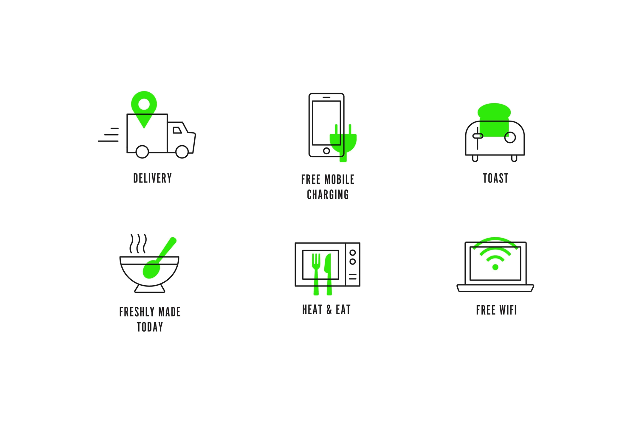We created a bold monochrome identity which used flashes of neon green as a highlight. Bespoke icons were created along with simple patterns which were used for packaging, signage, POS, uniforms and social media.