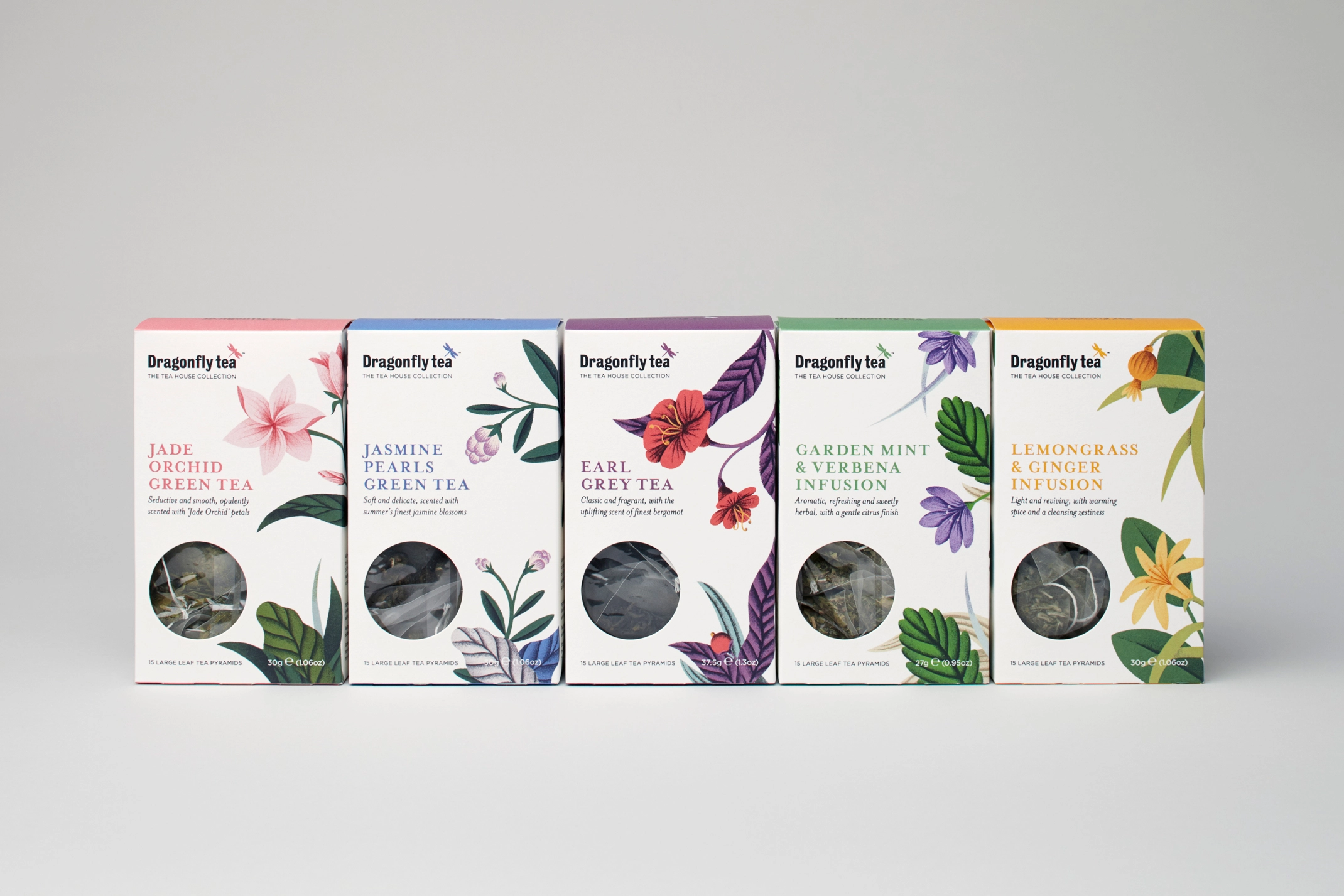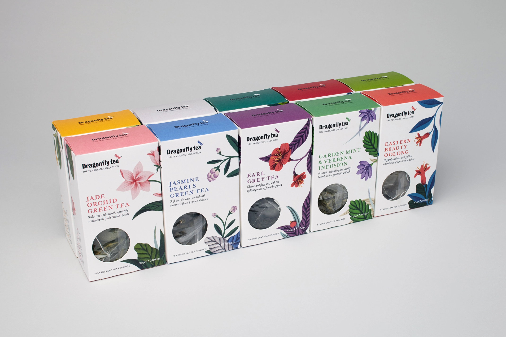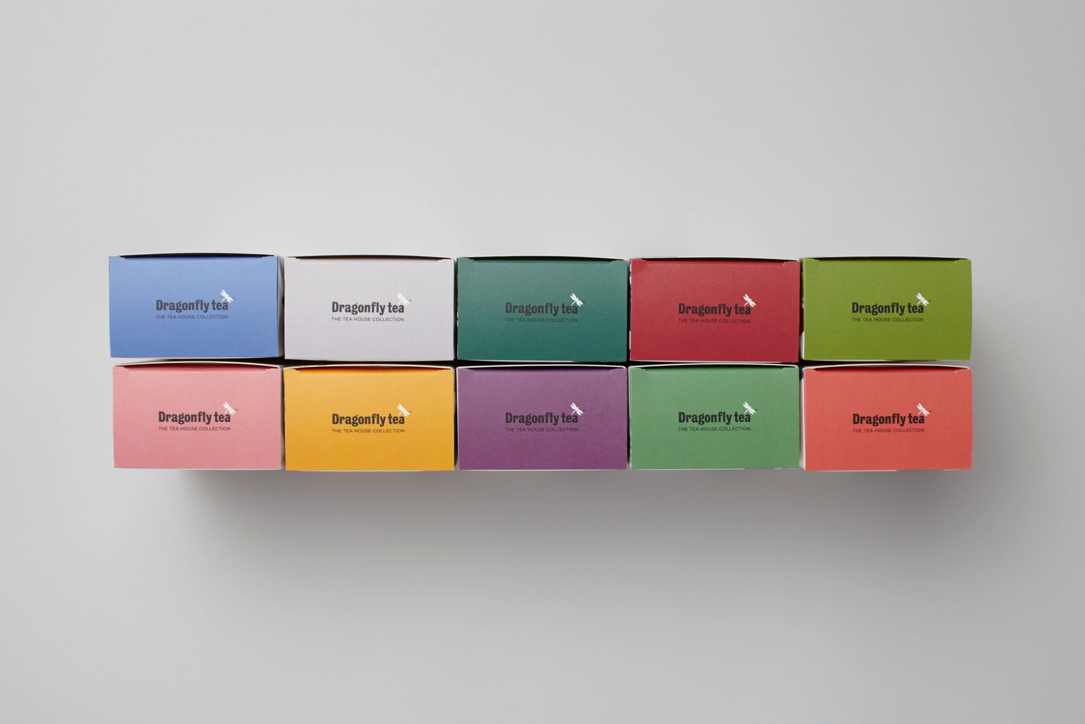 Dragonfly Tea are a family-owned, British company with a hundred year heritage of sourcing, growing and making the very purest and finest of teas. For the new Tea House Collection we were asked to create the packaging for ten luxury teas, each boxed with 15 leaf pyramid tea bags.
