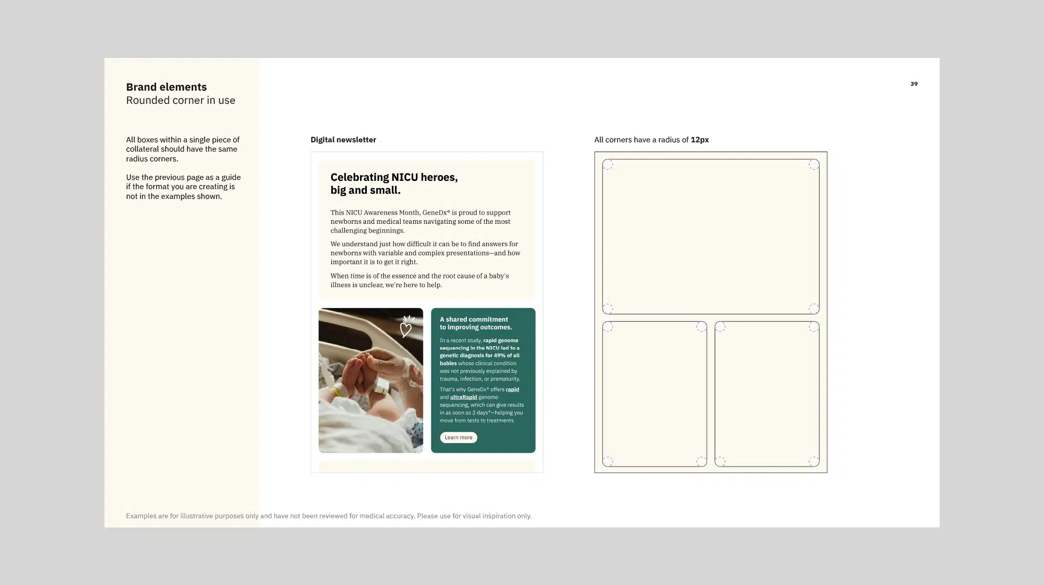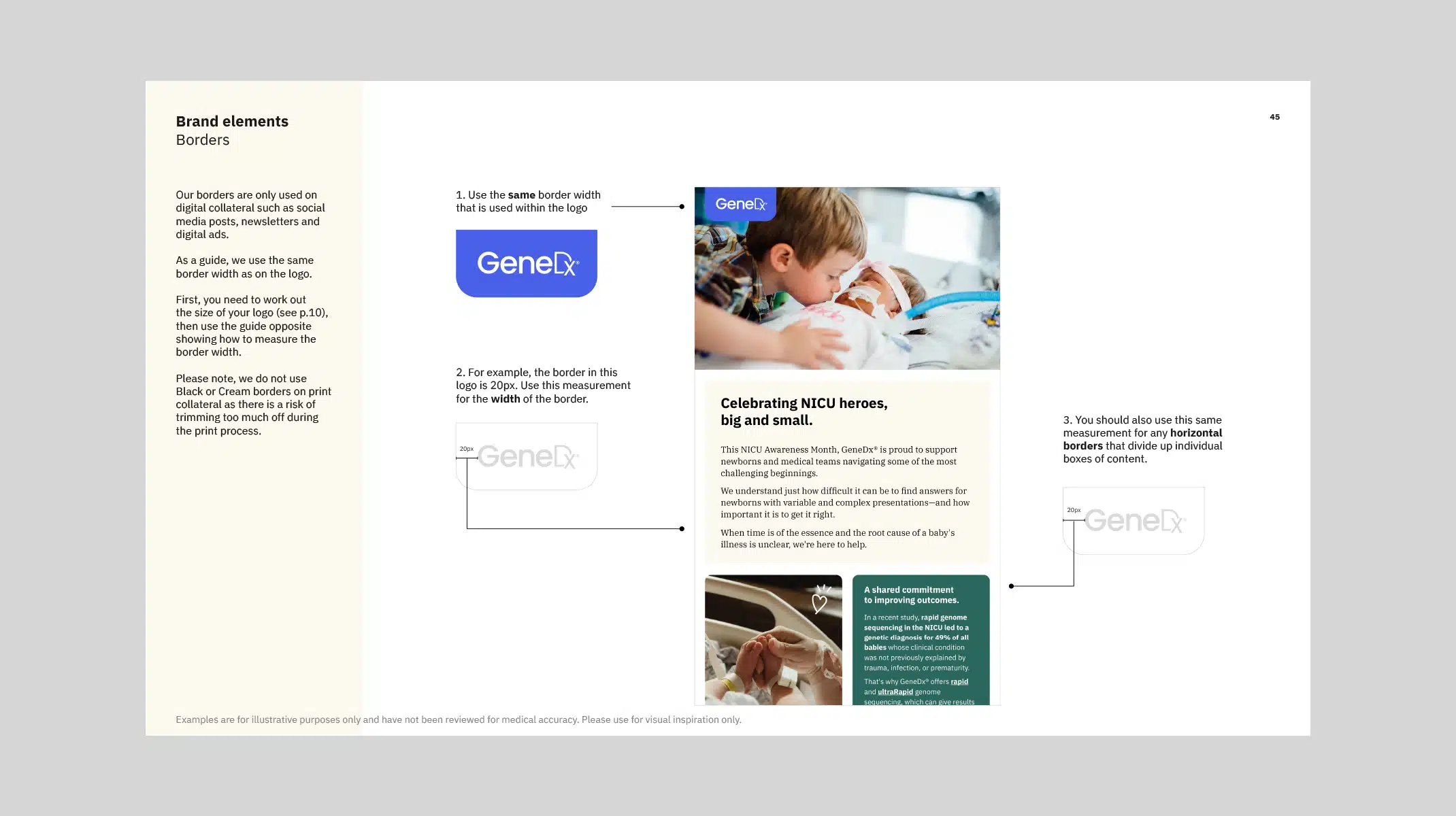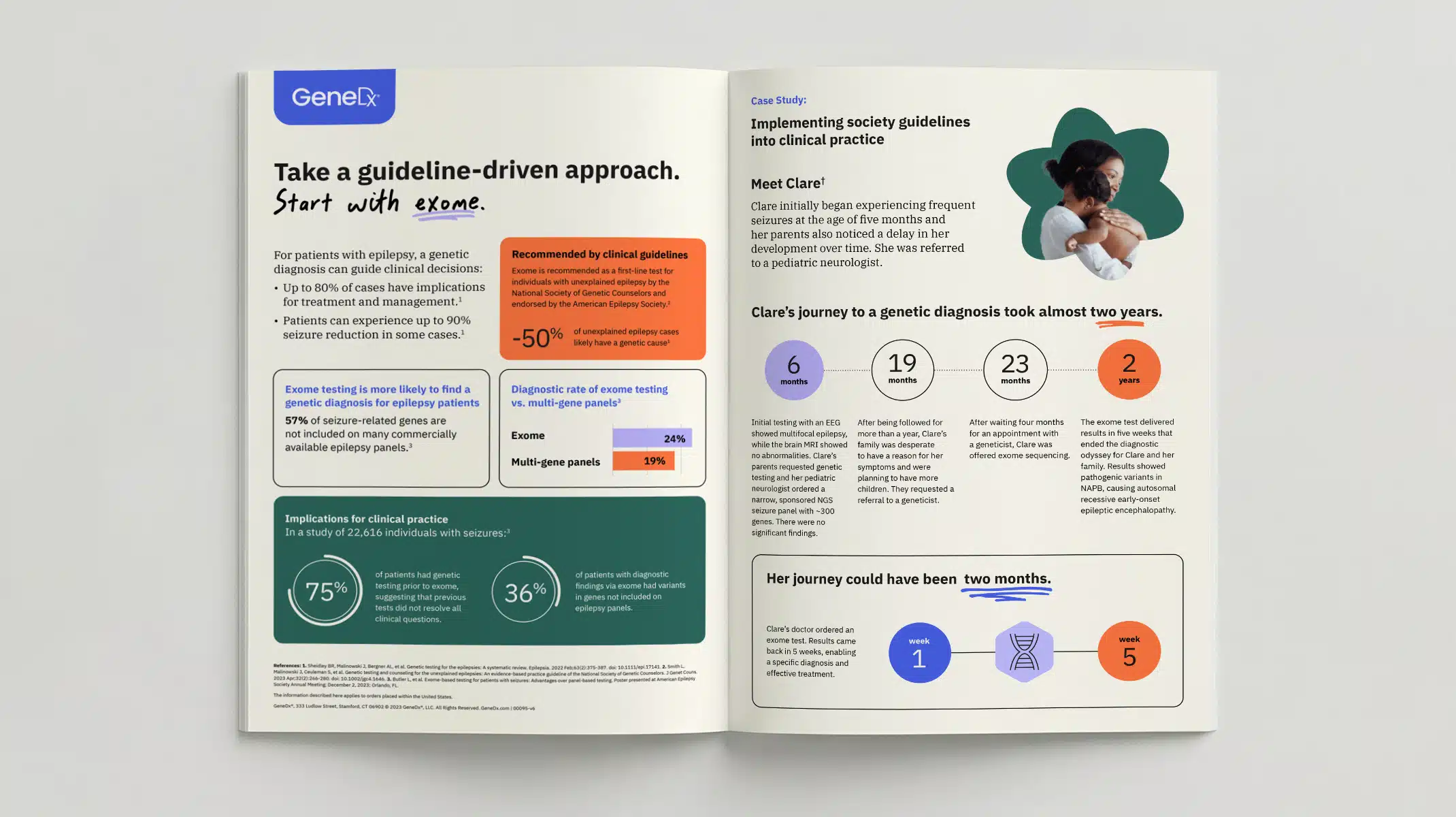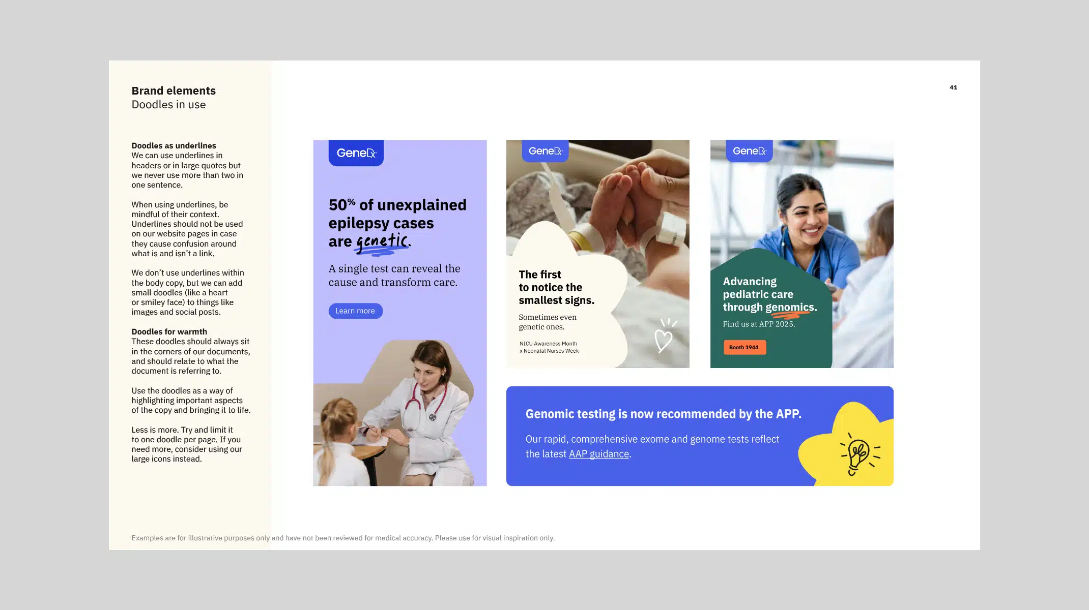 As the new brand identity was to be rolled out by GeneDx’s internal design team, it was essential that all elements were captured within a comprehensive set of brand guidelines. The document we crafted includes a wide range of examples covering both digital and print applications, alongside clear rules around the use of all brand elements.