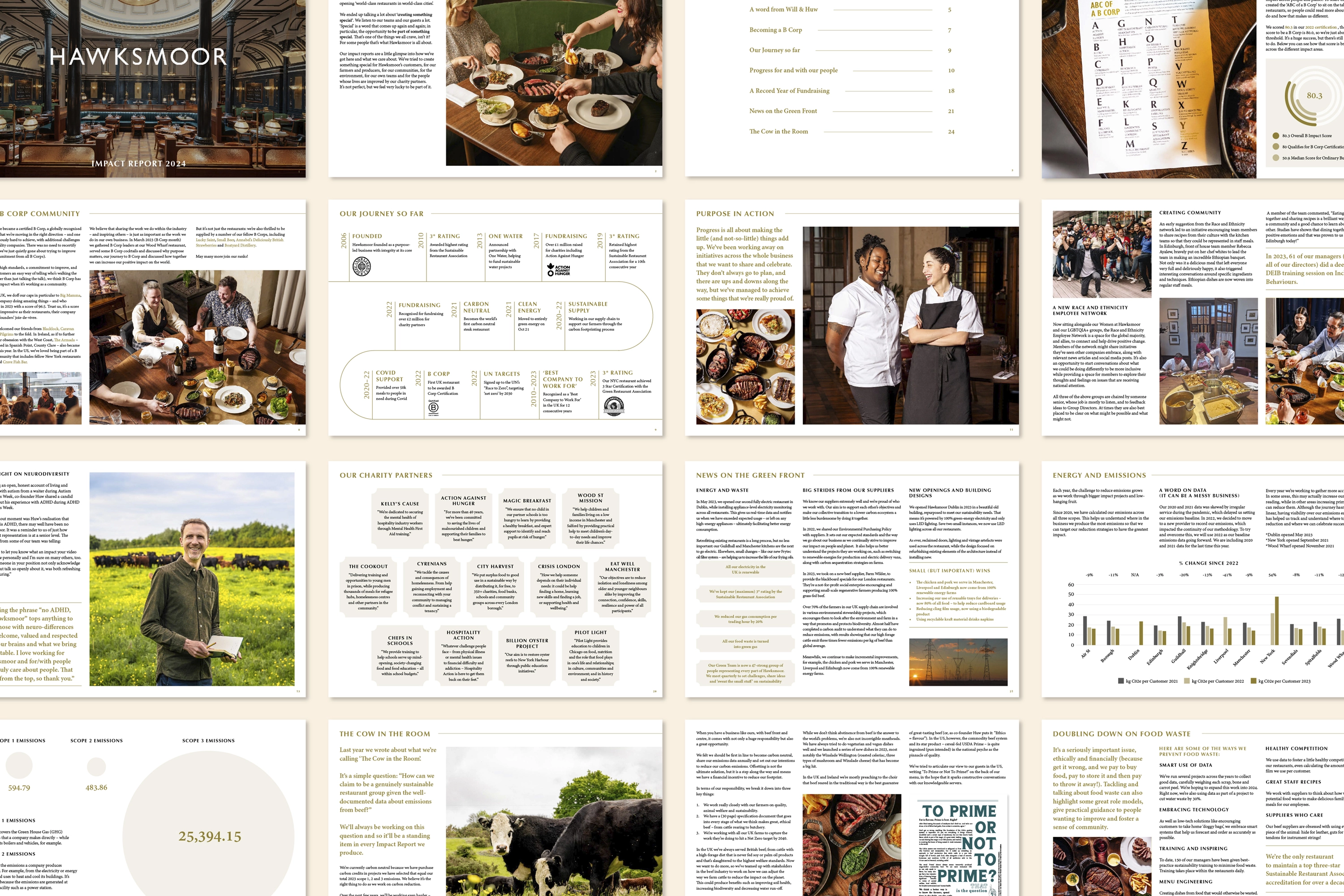 We recently worked with Hawksmoor to update the design of their Impact Report, focusing on a digital first approach and breaking up the text with easy to read diagrams, charts and pull quotes.