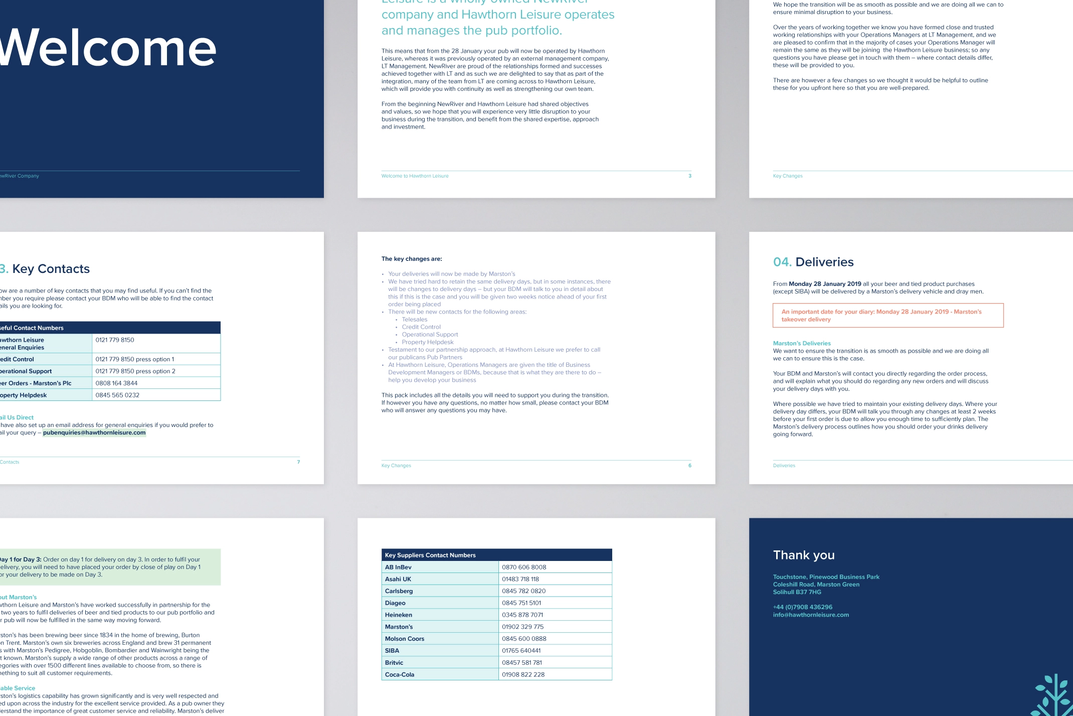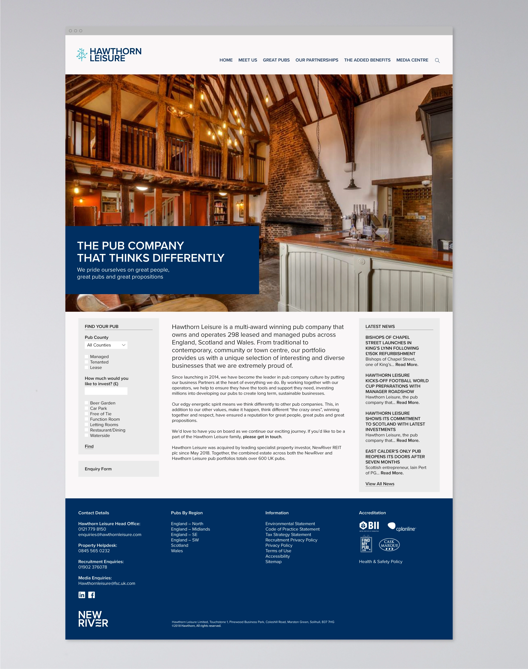 Hawthorn Leisure own and operate 300 leased and managed pubs across the UK. In 2018 they were acquired by NewRiver bringing the combined portfolio to a total of 600 pubs. As part of the merger we were asked to review and refine the Hawthorn Leisure visual identity so that it could be brought more inline with that of NewRiver’s.