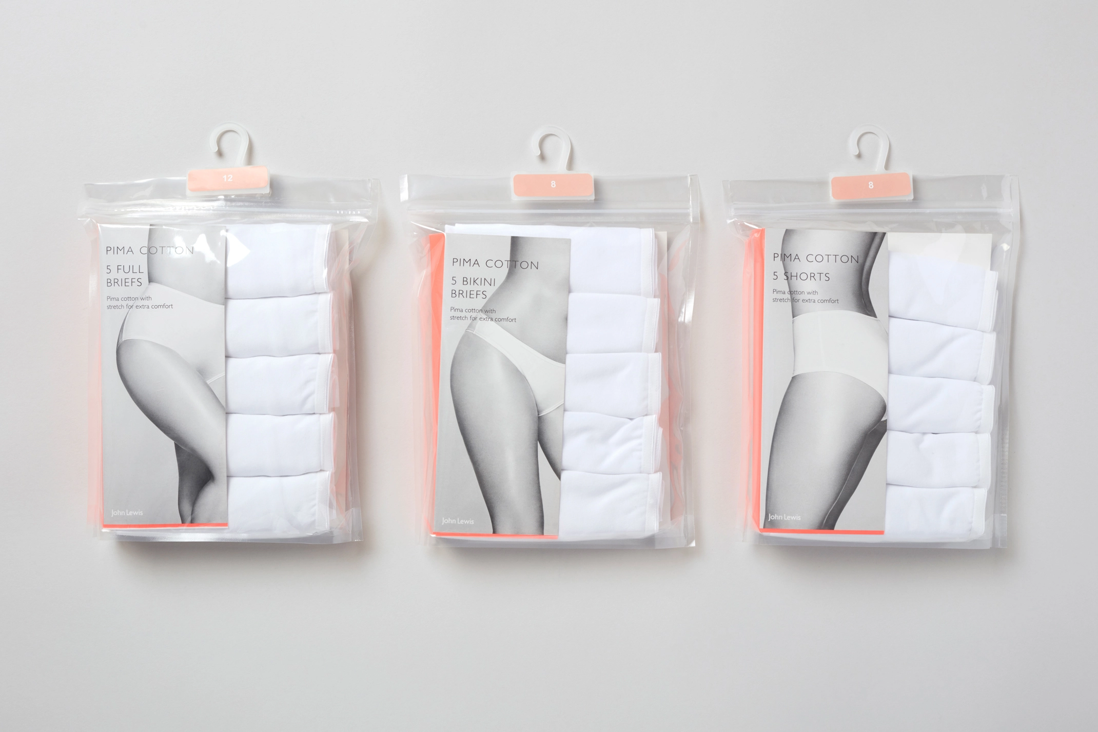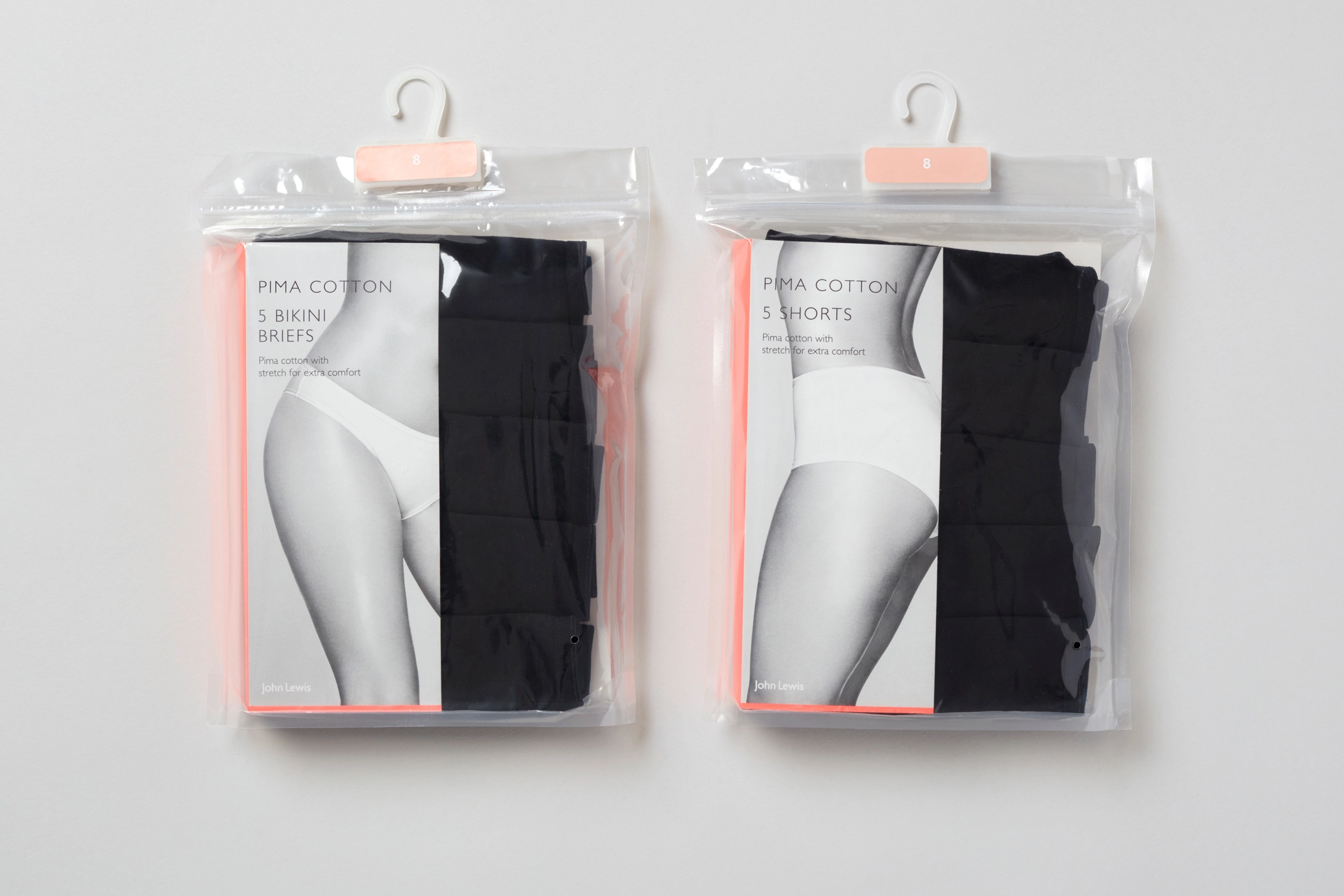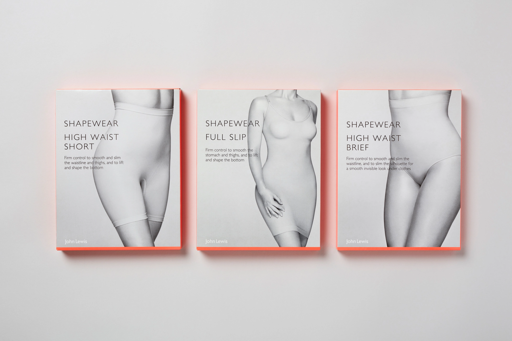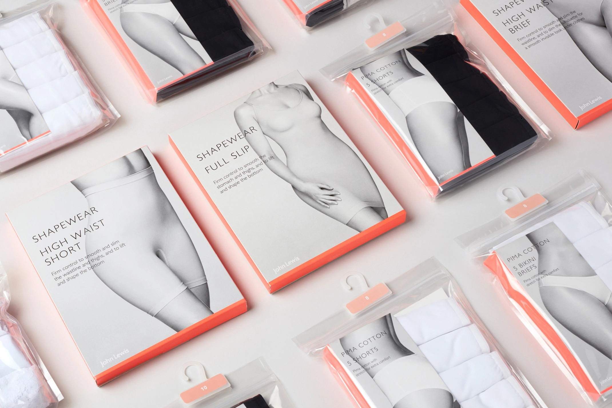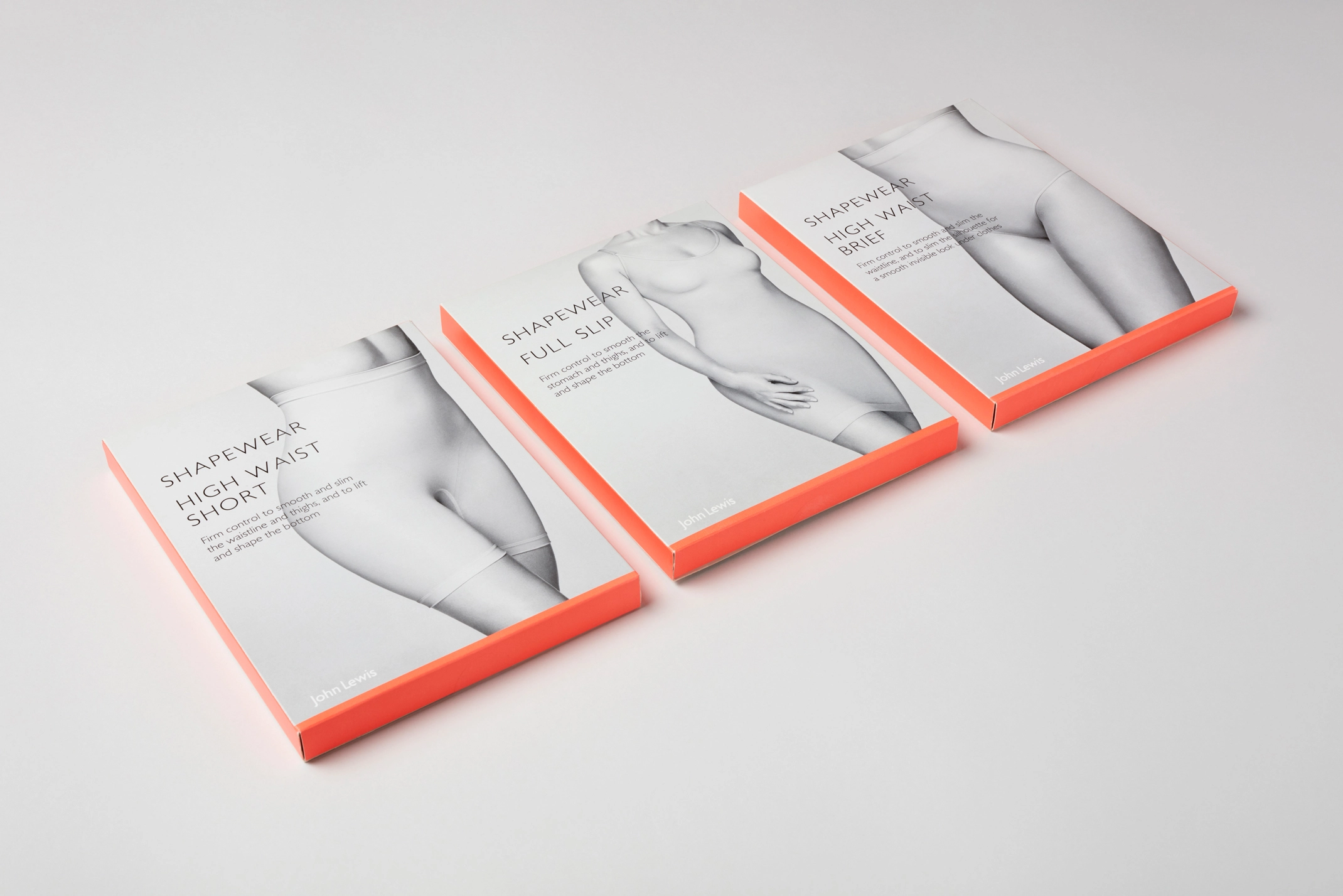 Packaging and art-direction for John Lewis’s own brand Shapewear and Lingerie. We updated and refreshed the design of the packaging within the range. Incorporating a brighter colour palette which included a neon orange to both compliment the black and white photography and give standout on the shop floor. Photography by Karina Twiss.