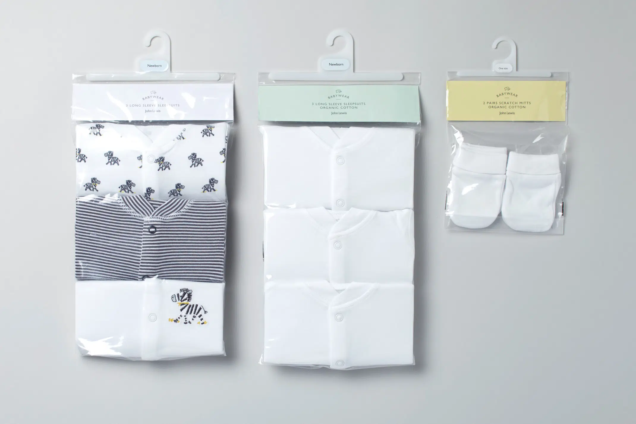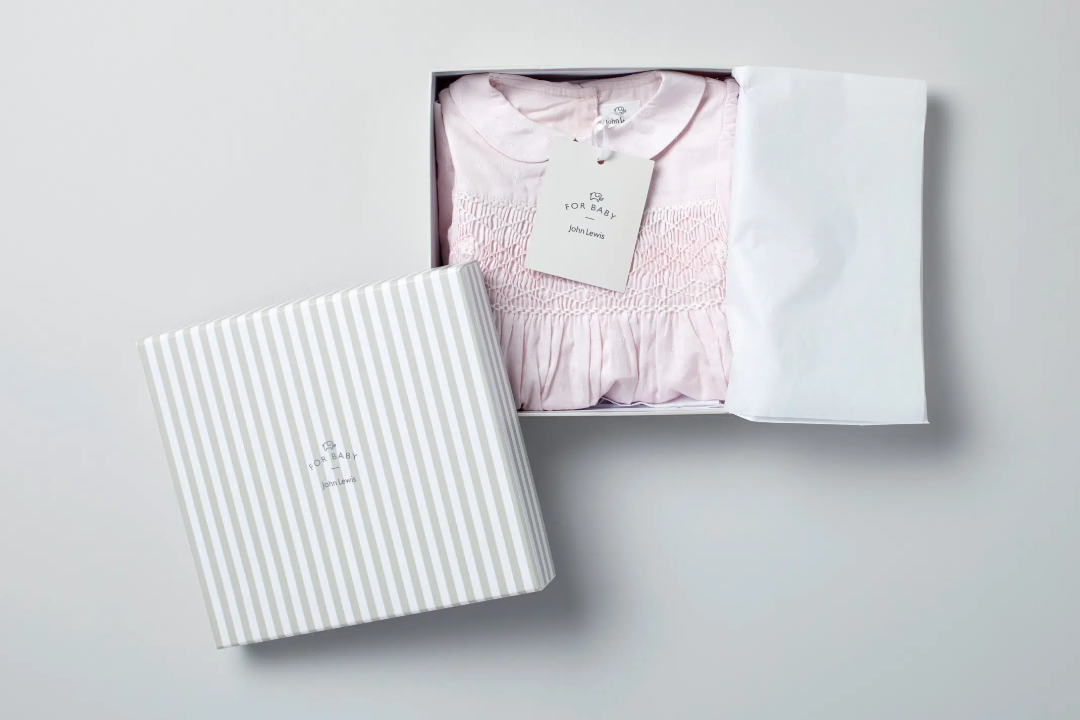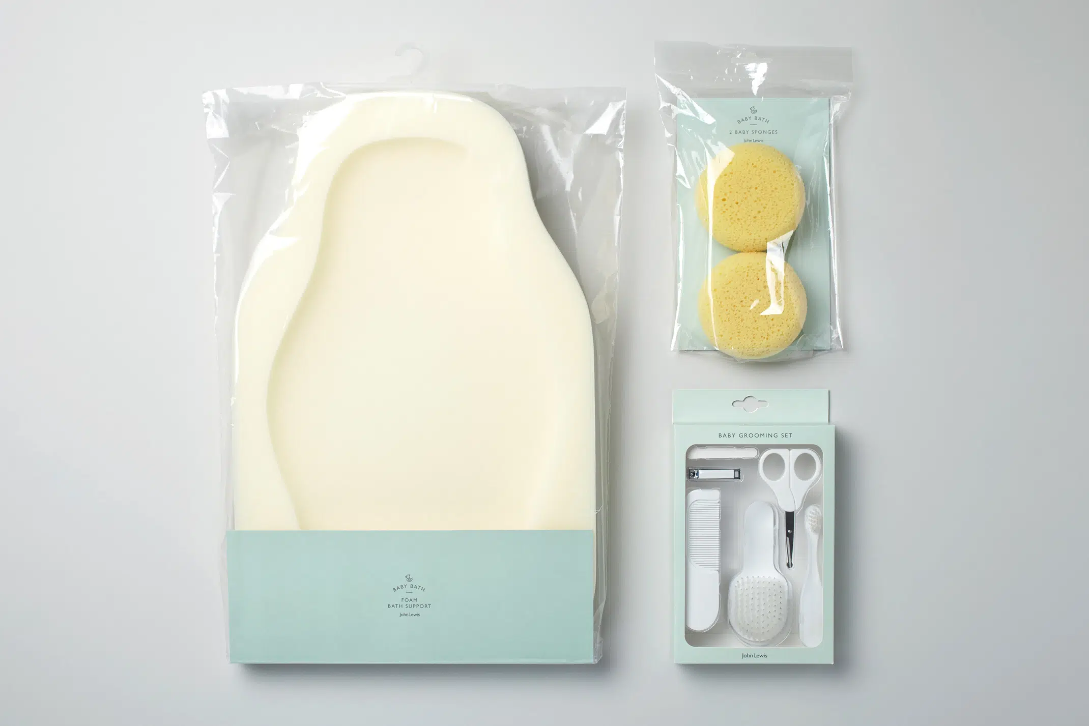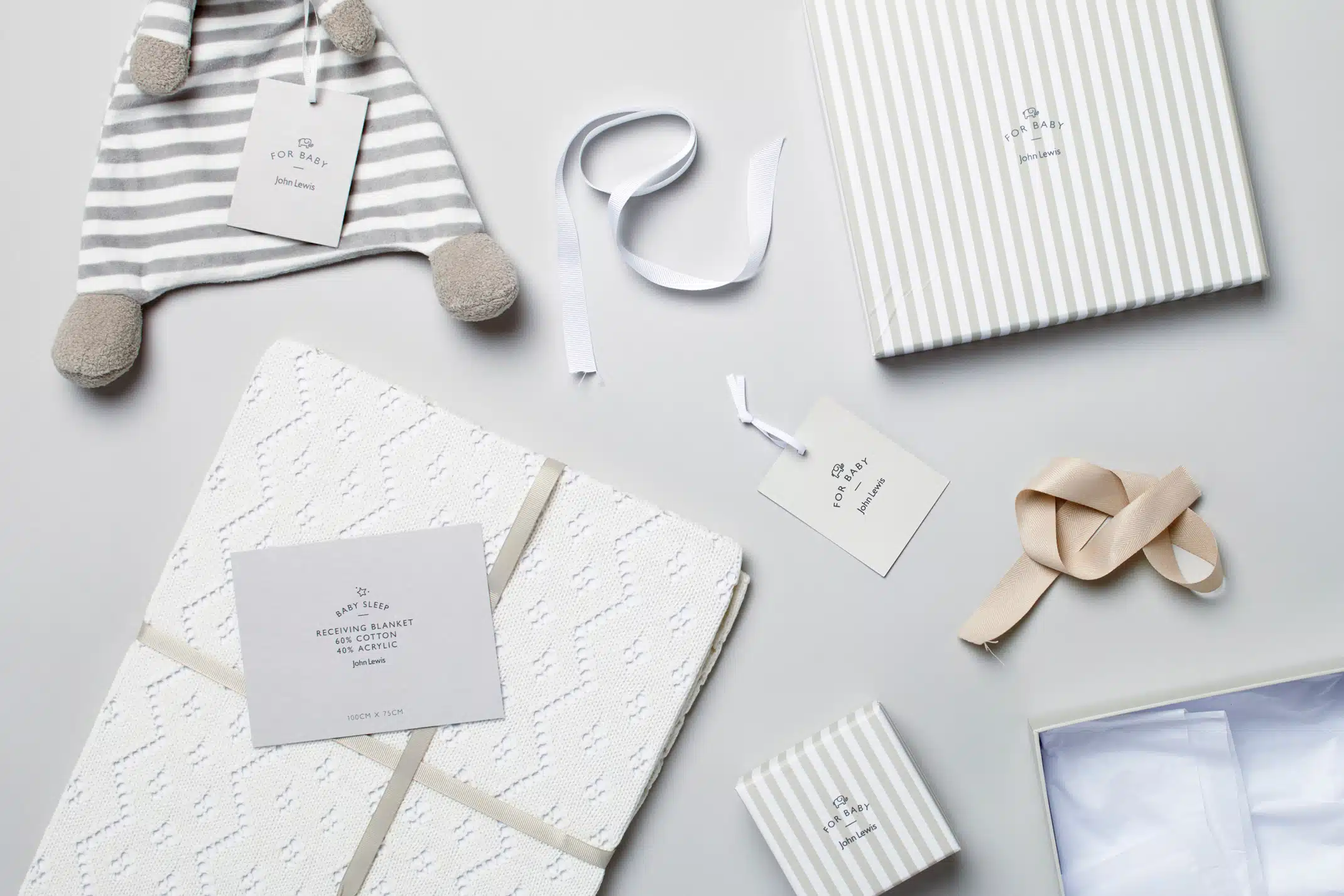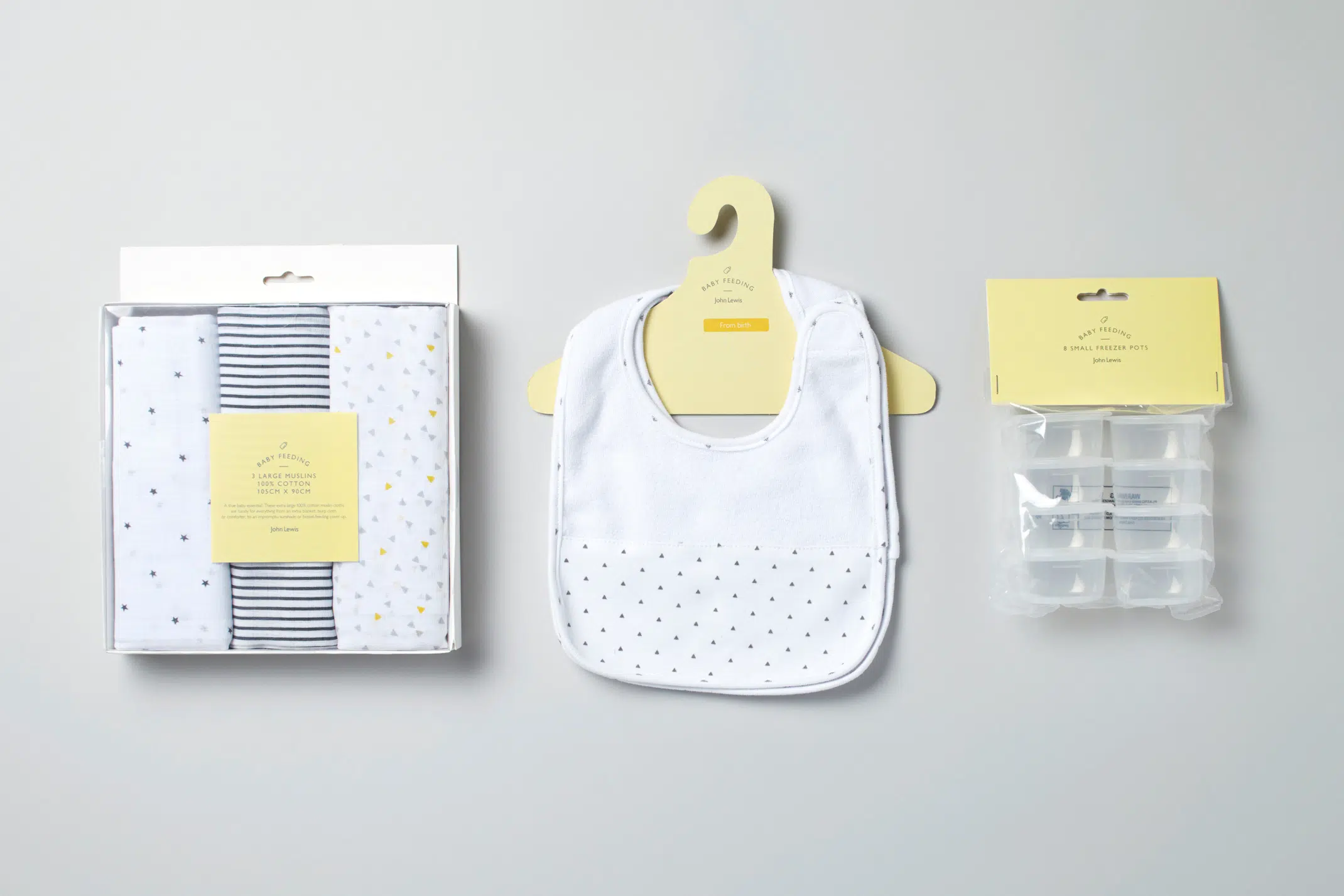 The nursery range in John Lewis covers a large variety of areas from clothing to bath time, feeding to gifts and everything in between. The result of this is a huge variety of products which all needed to be packaged with a similar look and feel, whilst not distracting from the packed contents.