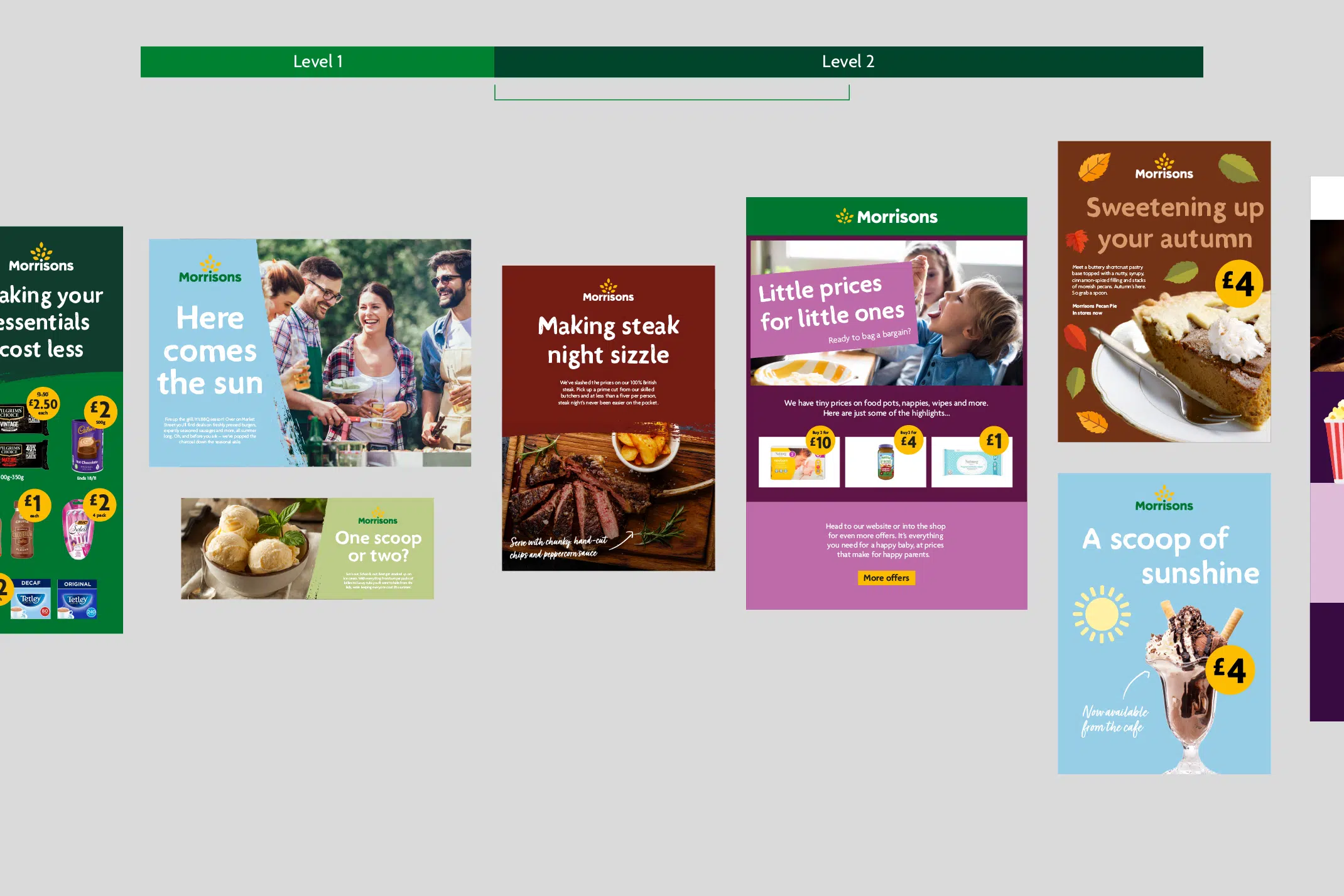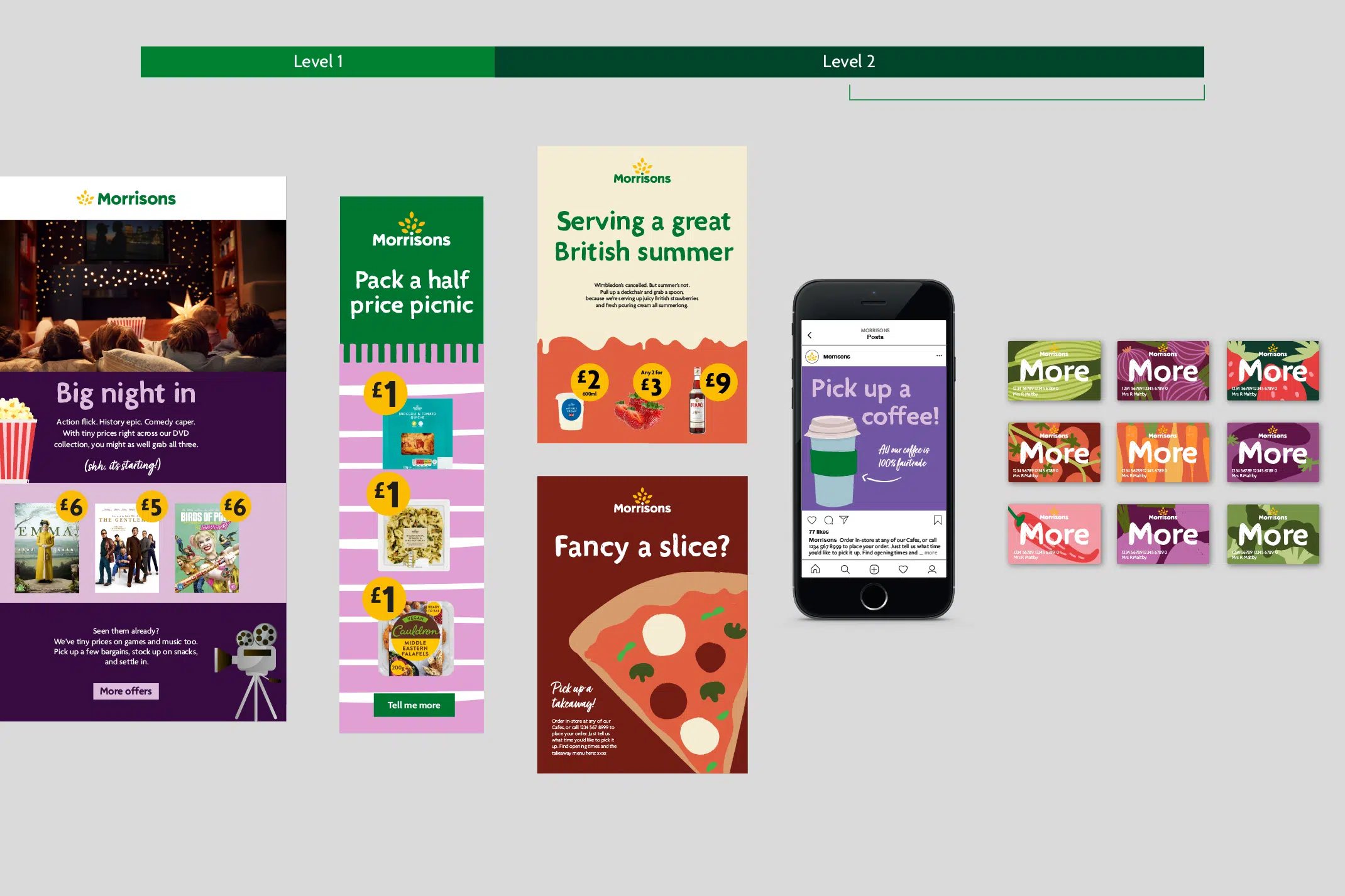 The identity needed enough flexibility to cover core collateral, such as bags and livery, as well as more playful communications like email newsletters and social media posts. We created a level system that featured two levels: Level 1 and Level 2. Each level is made up of different assets that come together to create something distinctively, recognisably Morrisons.