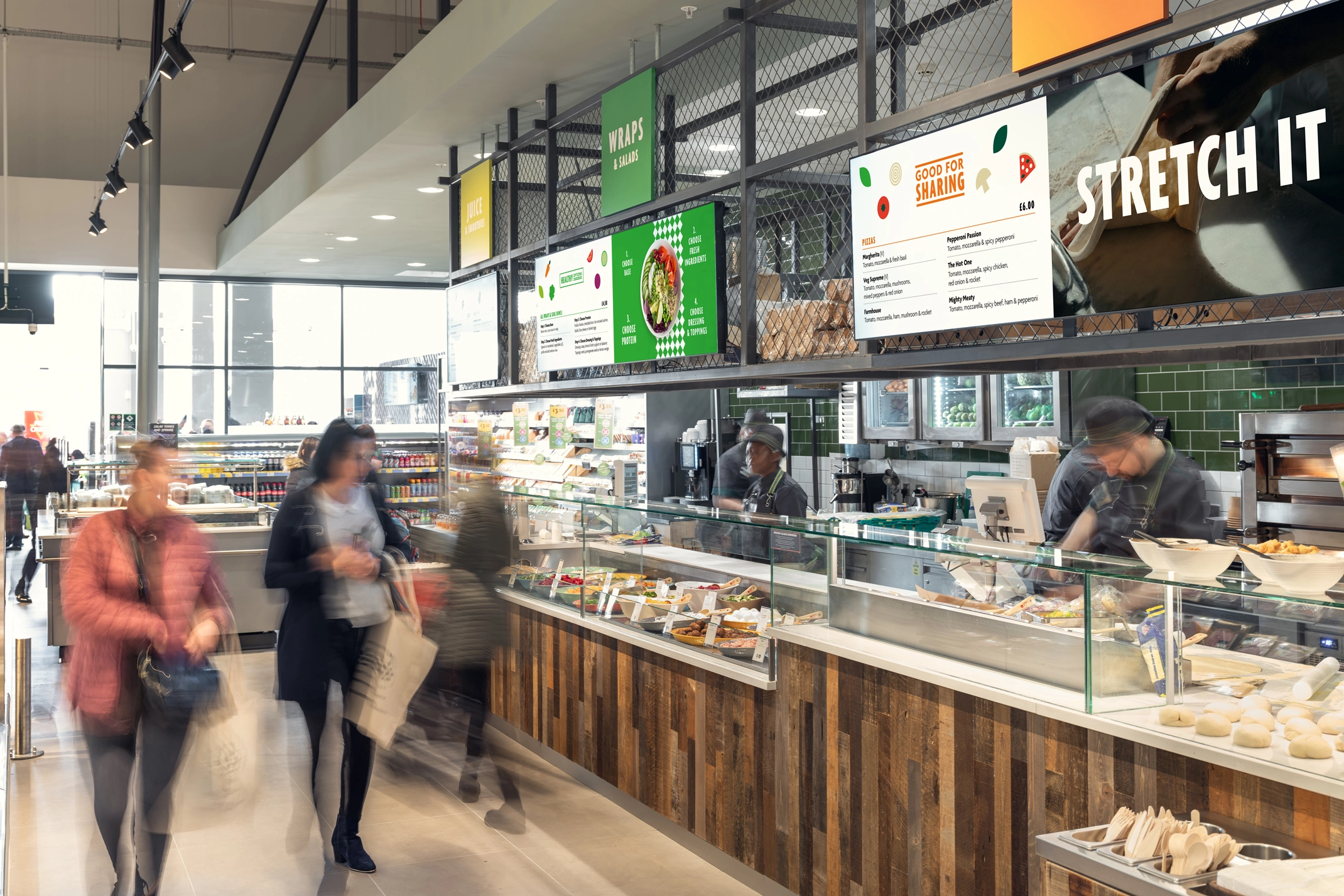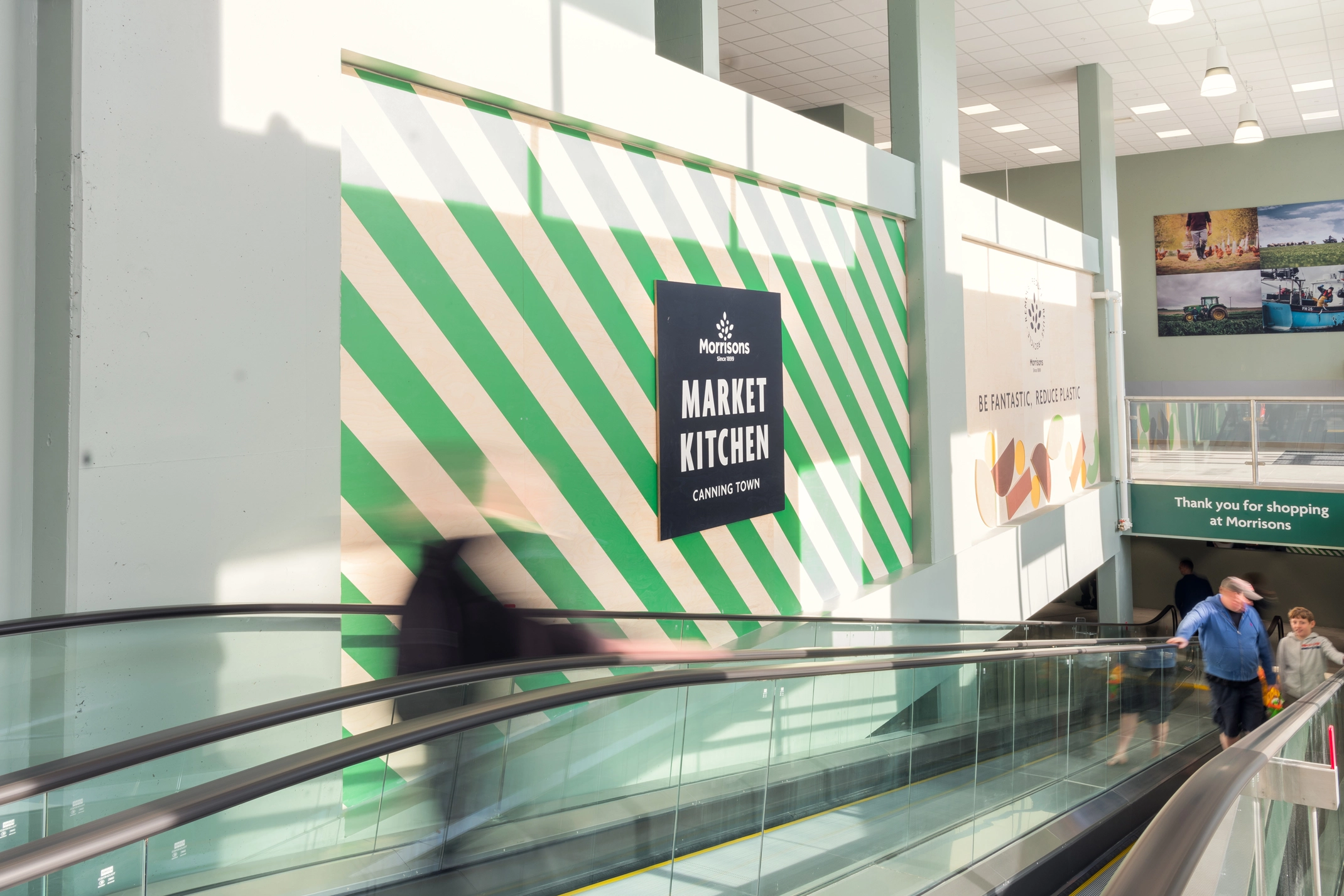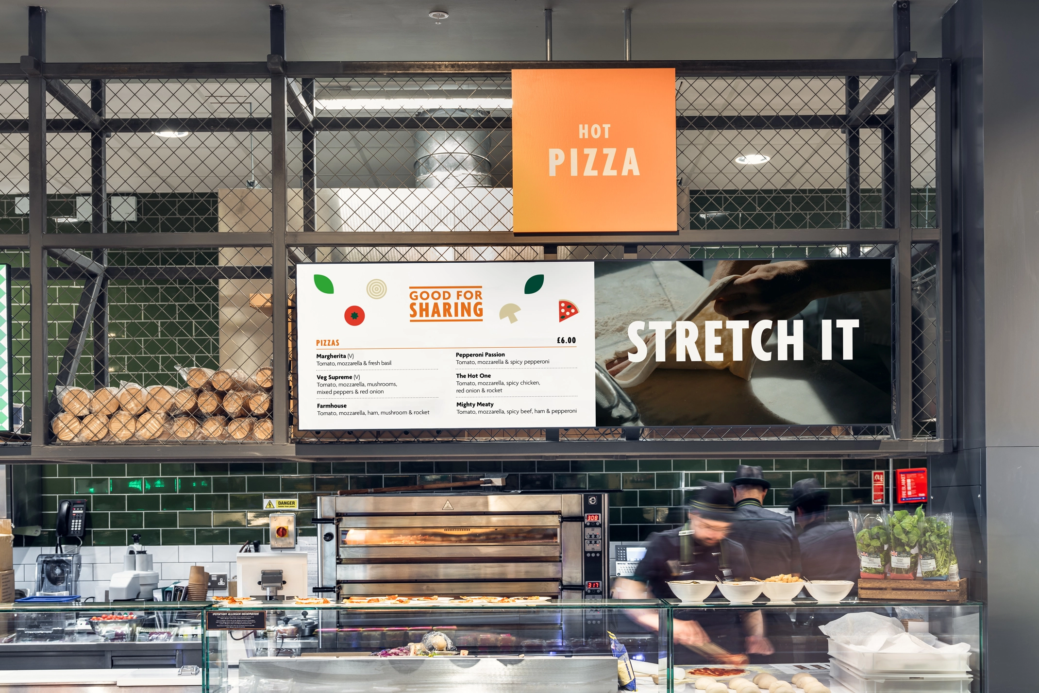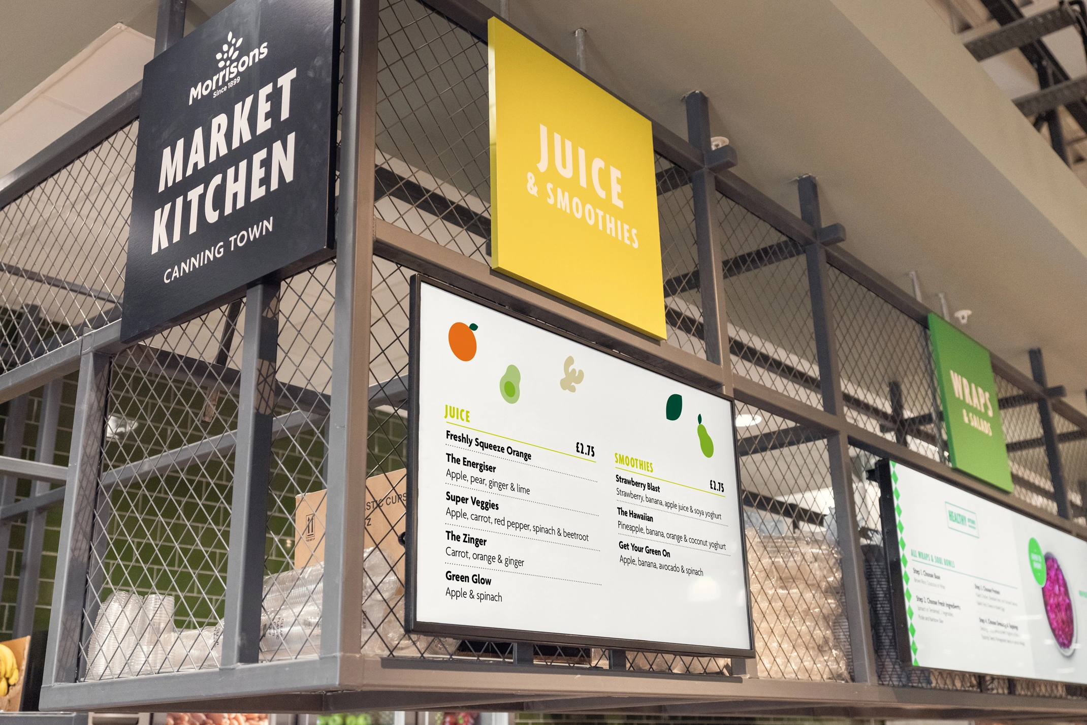 We worked with Morrisons on the roll out and implementation of the identity in the Canning Town store, in particular how the digital screens would sit above the food counter stalls.