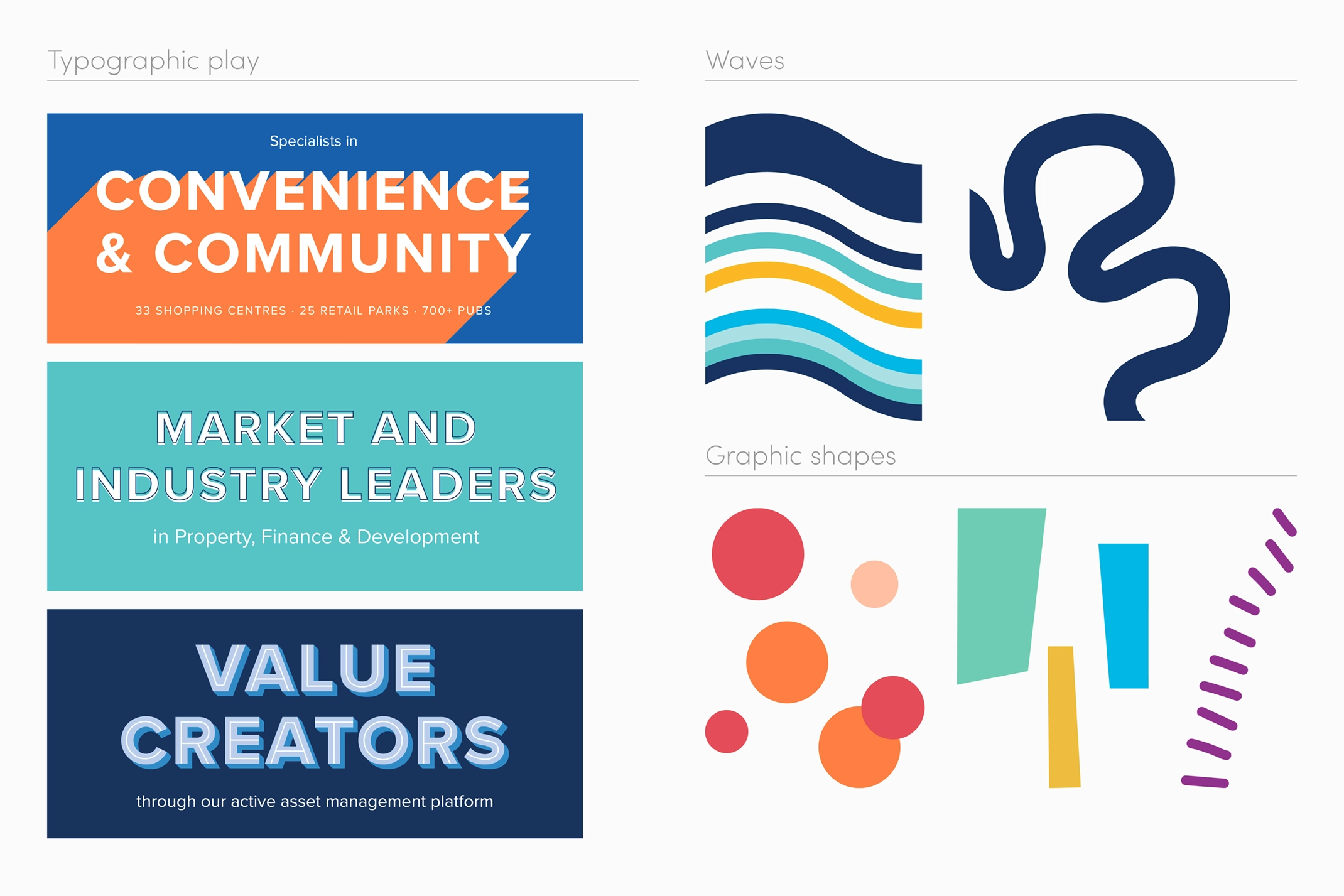 We began by auditing NewRiver’s existing brand assets and identifying ways these could be pushed. We introduced a secondary colour palette of brights which could also be used as 50% tints. These complimented the existing ‘corporate’ palette whilst increasing the sense of fun and personality.