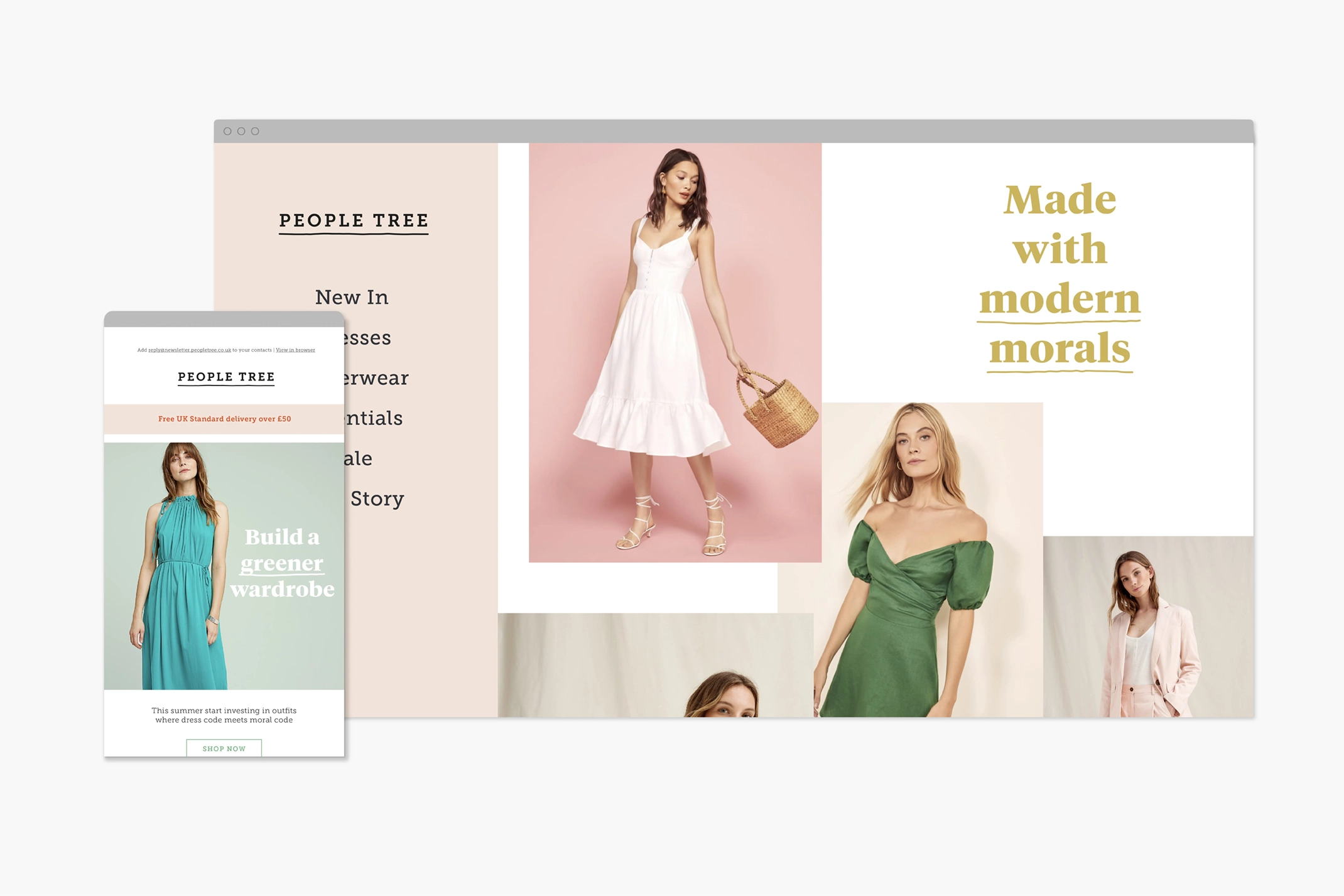 We worked with brand strategist Debbie Taffler to help identity a solid brand position for People Tree, and with copywriter Anna Whitaker to establish a framework for tone of voice. The visual identity needed to reflect the eco nature of the brand, whilst also feeling fresh and modern. We used hand drawn elements and patterns throughout the identity to complement the hand made nature of the clothing, and paired them with a fresh colour palette and bold typography. These new elements were used successfully across packaging and sales collateral to help reinforce the brands eco yet modern approach to design.