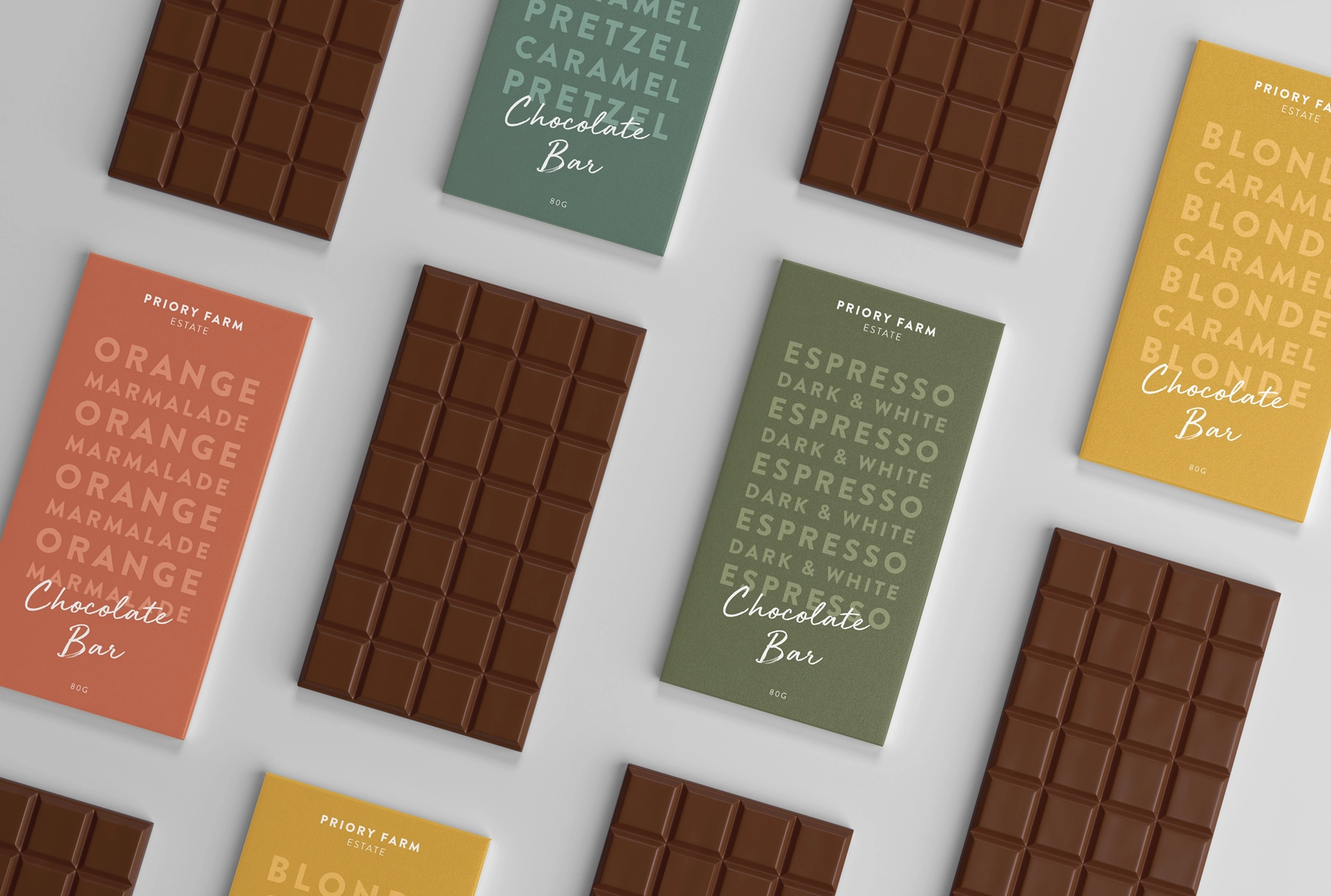 Priory Farm were also developing some new products which required packaging. We used the new brand elements across a range of items including chocolate bars, coffee and candles.