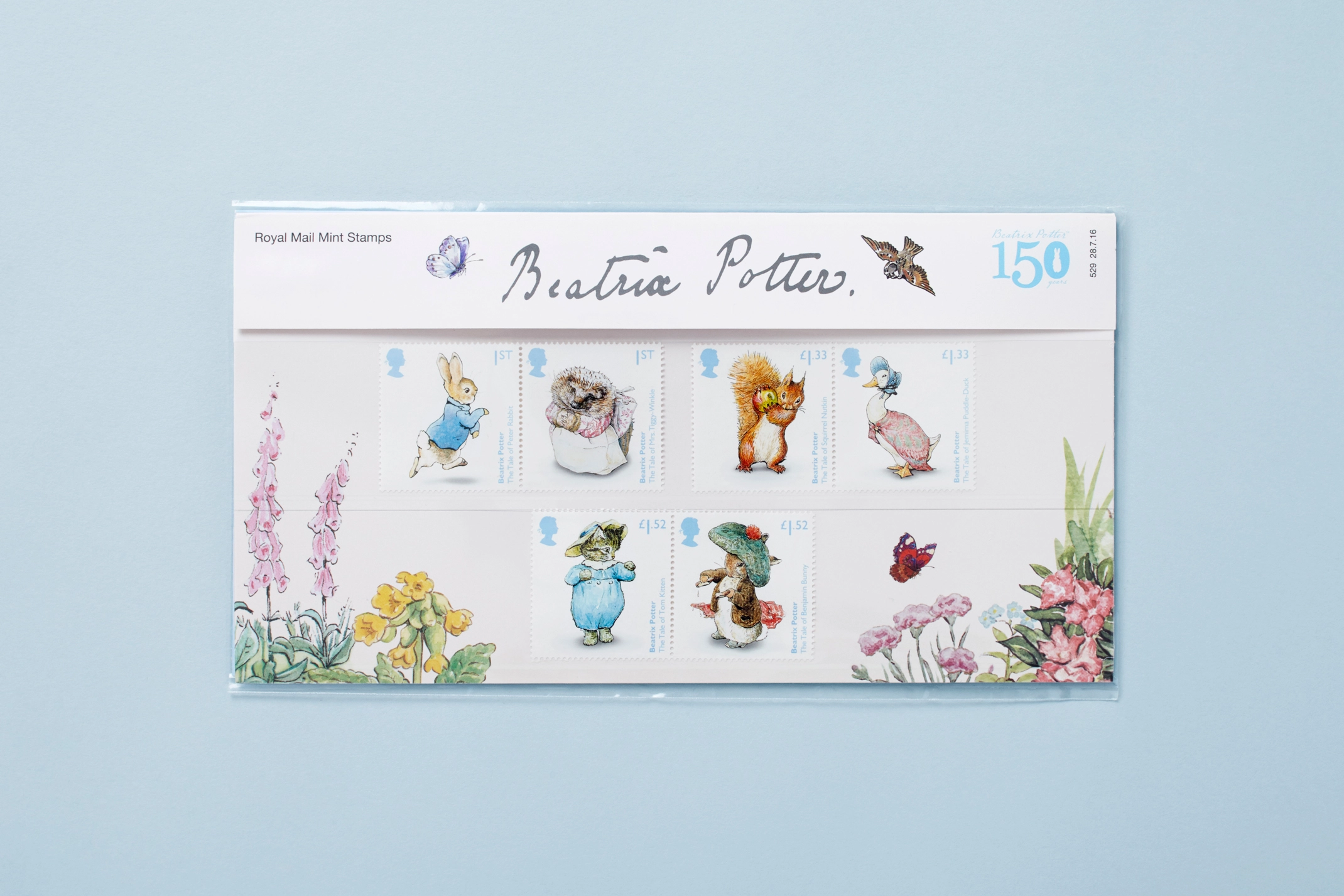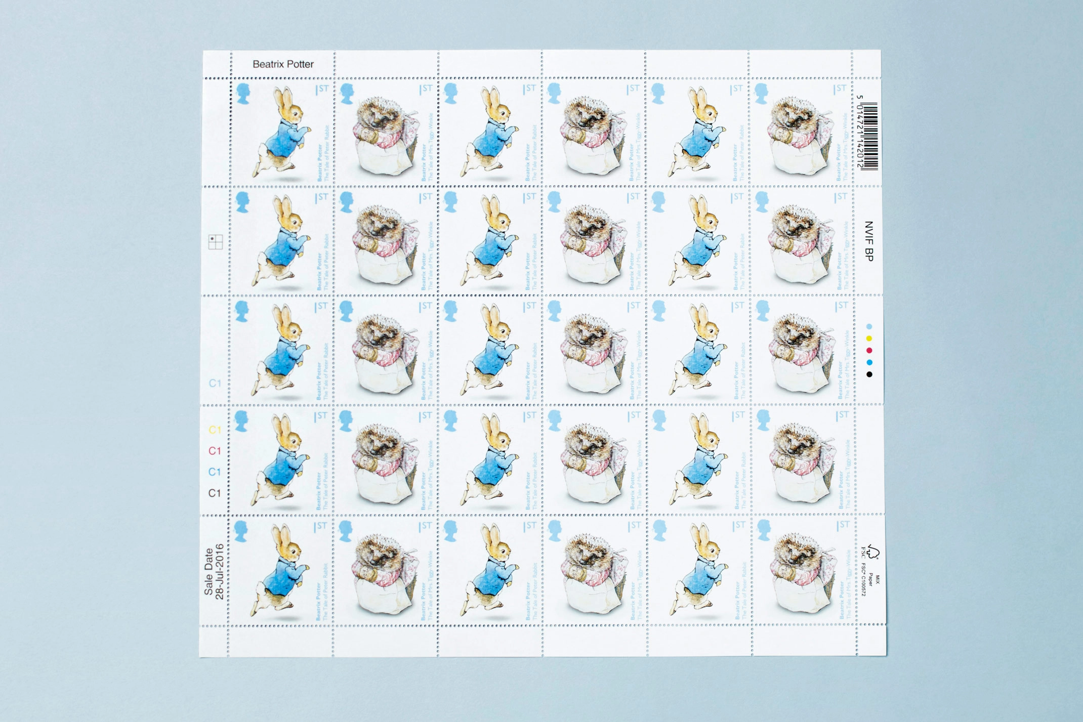 To celebrate the 150th anniversary of Beatrix Potter’s birth Royal Mail asked us to design a set of six celebratory stamps. The special stamps feature the original illustrations of some of Beatrix Potter’s much loved characters; Peter Rabbit, Mrs. Tiggy-Winkle, Squirrel Nutkin, Jemima Puddle-Duck, Tom Kitten and Benjamin Bunny.