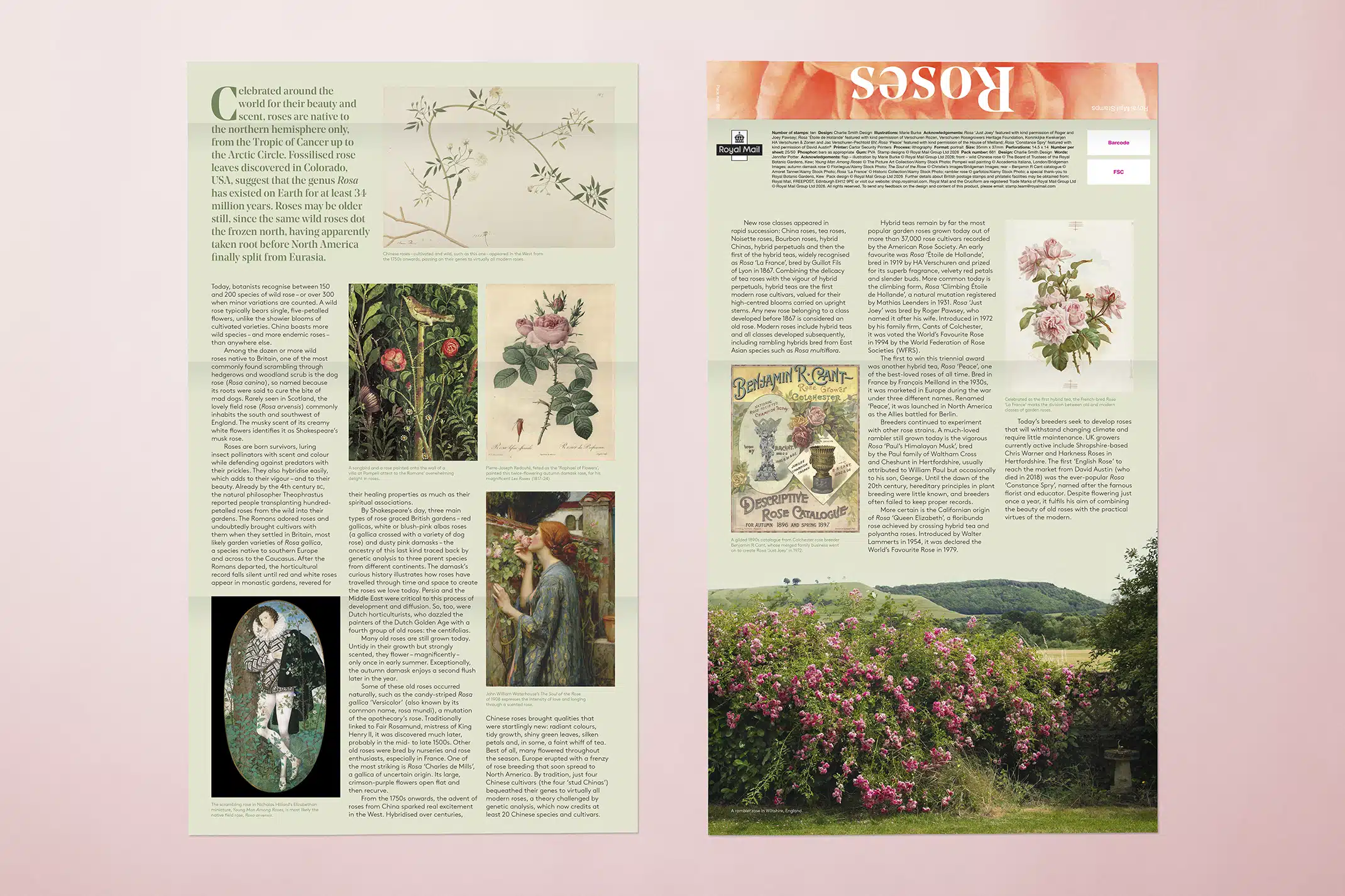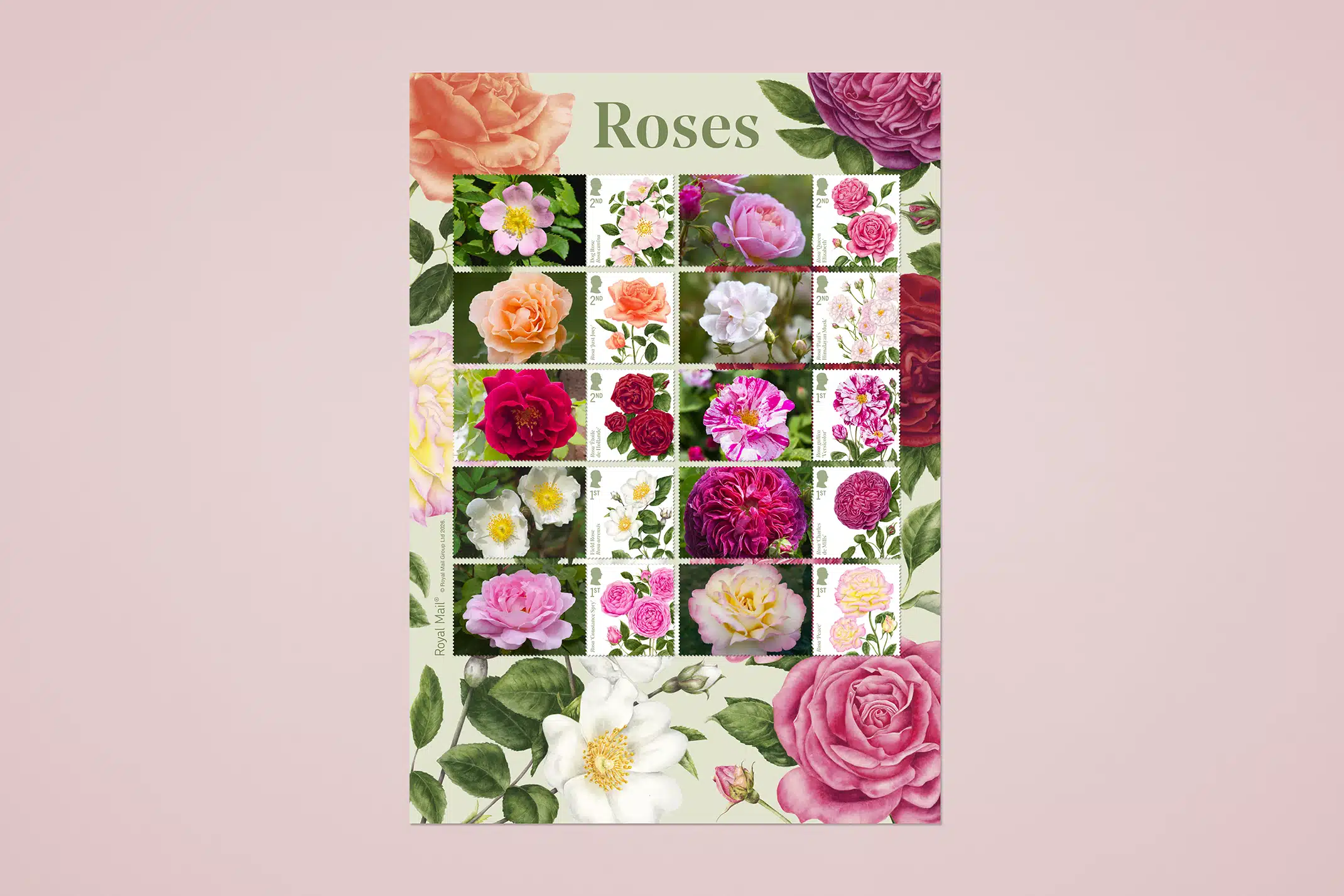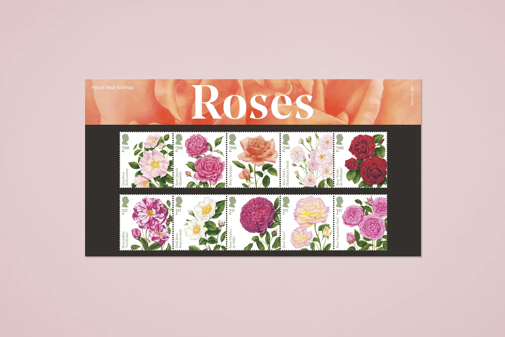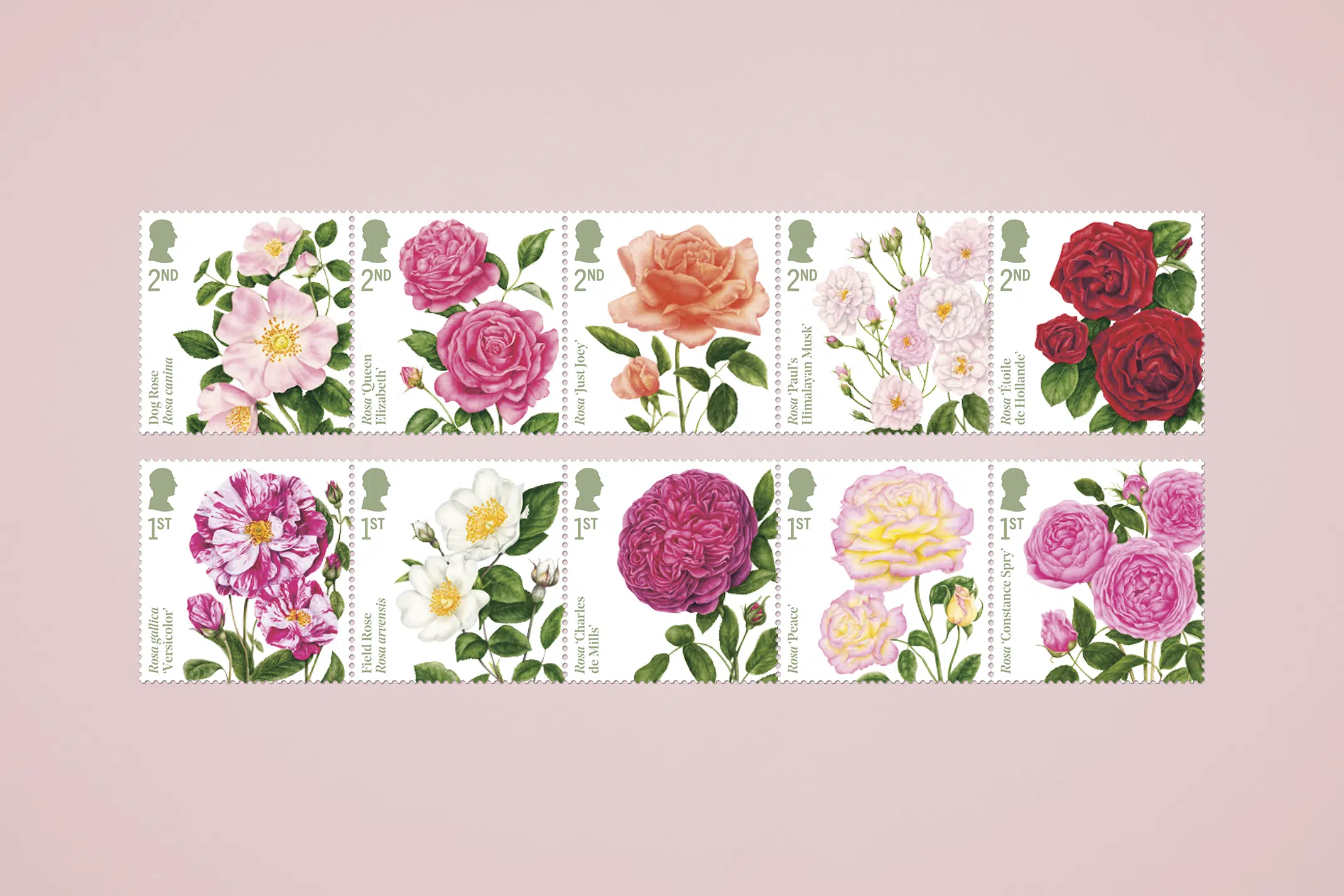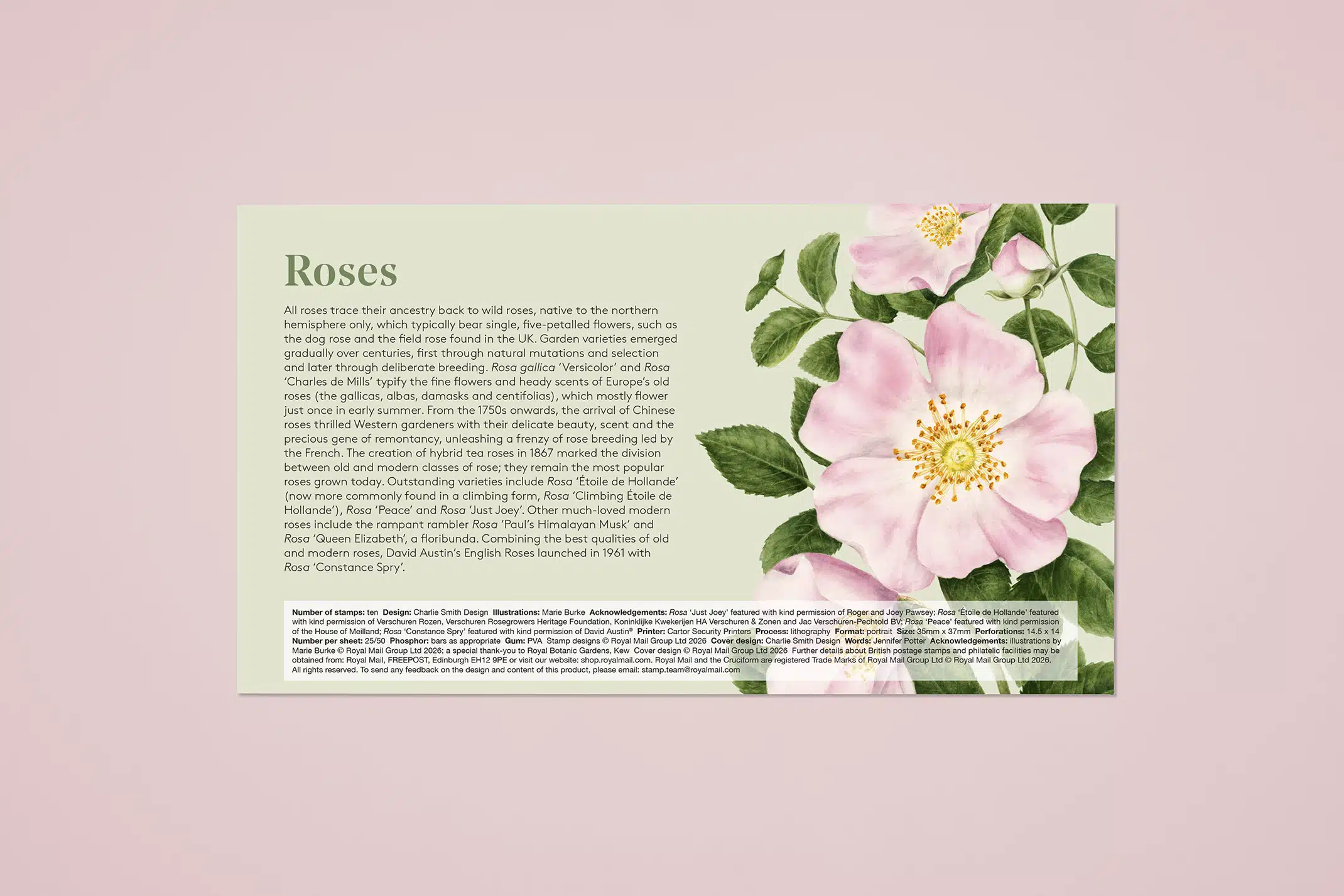 Royal Mail commissioned us to design a Special Stamp issue and range of products celebrating the wild and garden roses found across the UK. We worked with watercolour artist Marie Burke to create a set of ten rose illustrations for the stamps, each depicting a rose at a different stage of growth and capturing its distinctive habit.