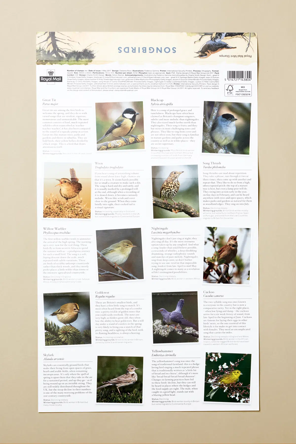Royal Mail approached us to design the Presentation Pack, First Day Envelope and Hand Stamps for their Songbirds collection. We worked with illustrator Federico Gemma on the project.